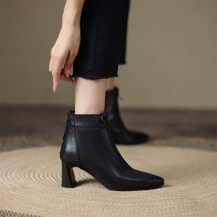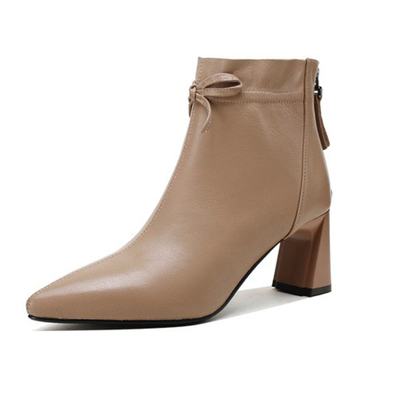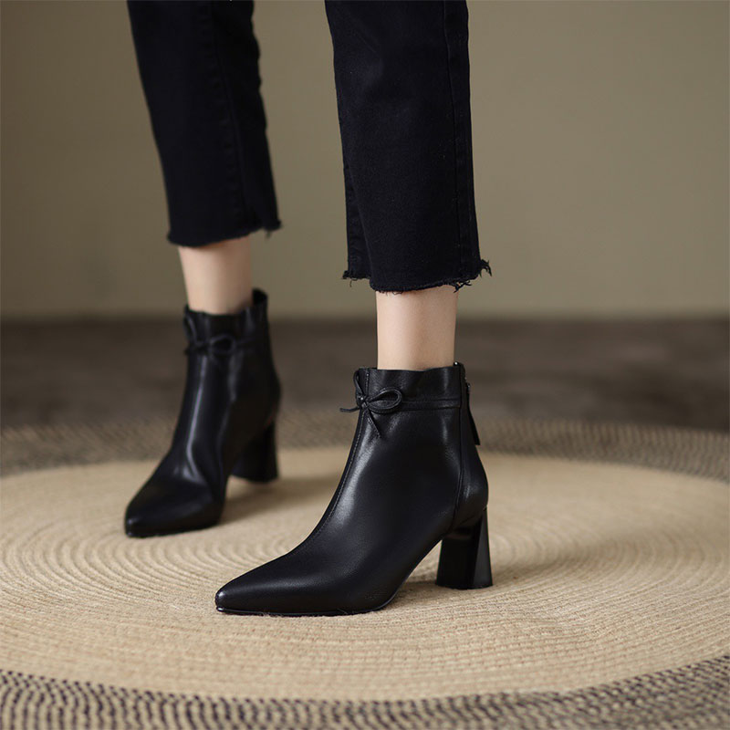 靴真皮短靴 百搭尖头粗跟加绒舒适蝴蝶结舒适短筒时尚 秋冬新款 时尚