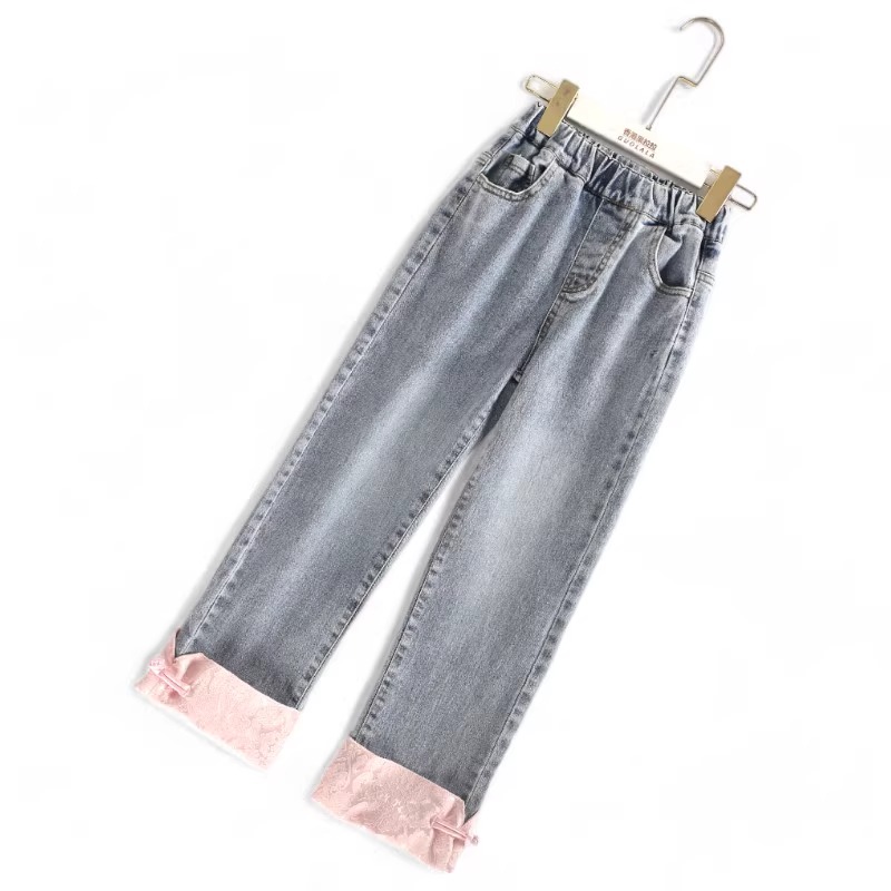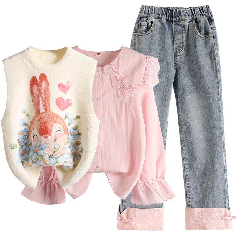 2025春秋装 三件套秋冬季 新款 牛仔裤 小女孩马甲花边领衬衫 女童套装