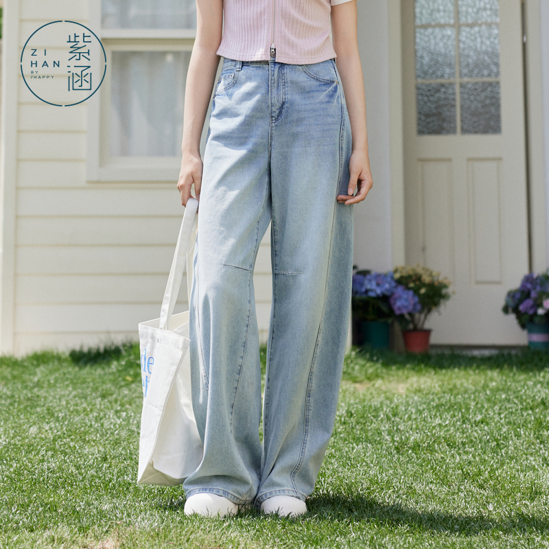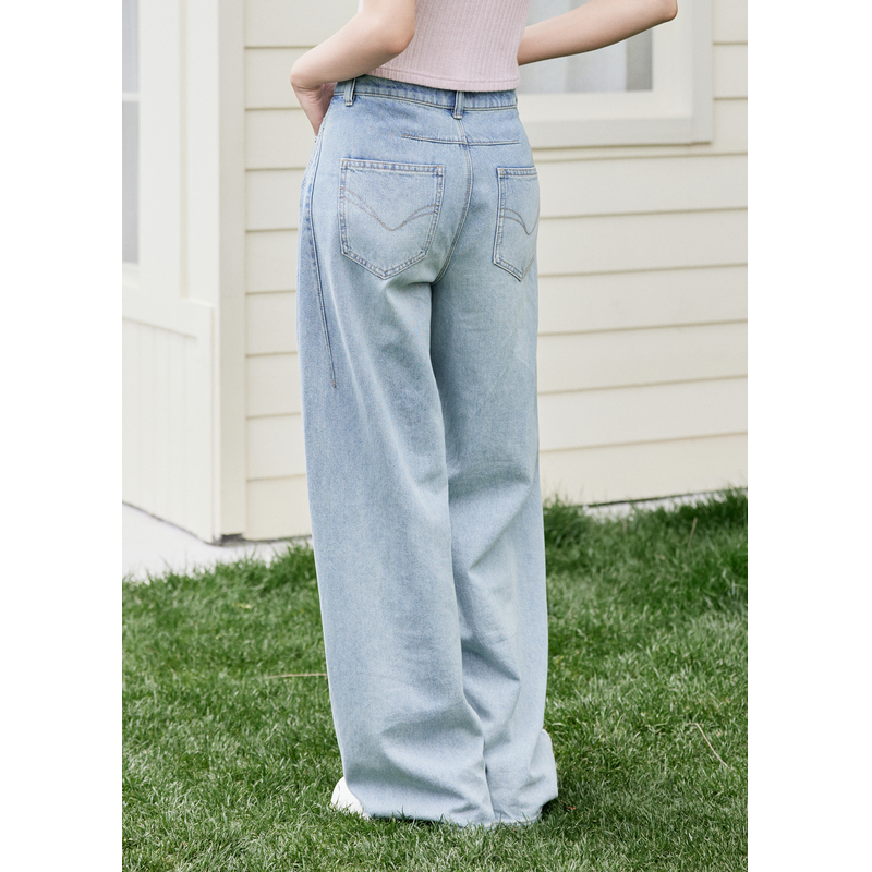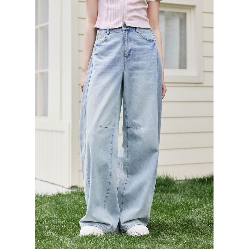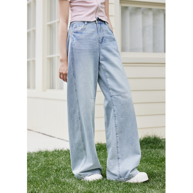 BDS1KD1509 女25春秋新宽松淡人阔腿裤 播商场同款 高腰水洗灰牛仔裤
