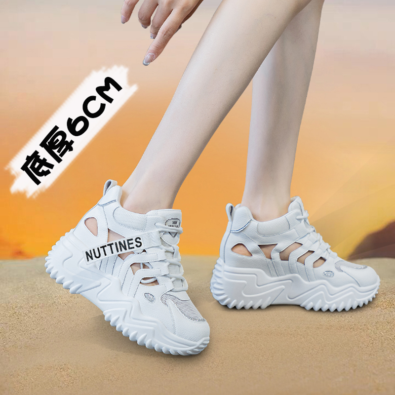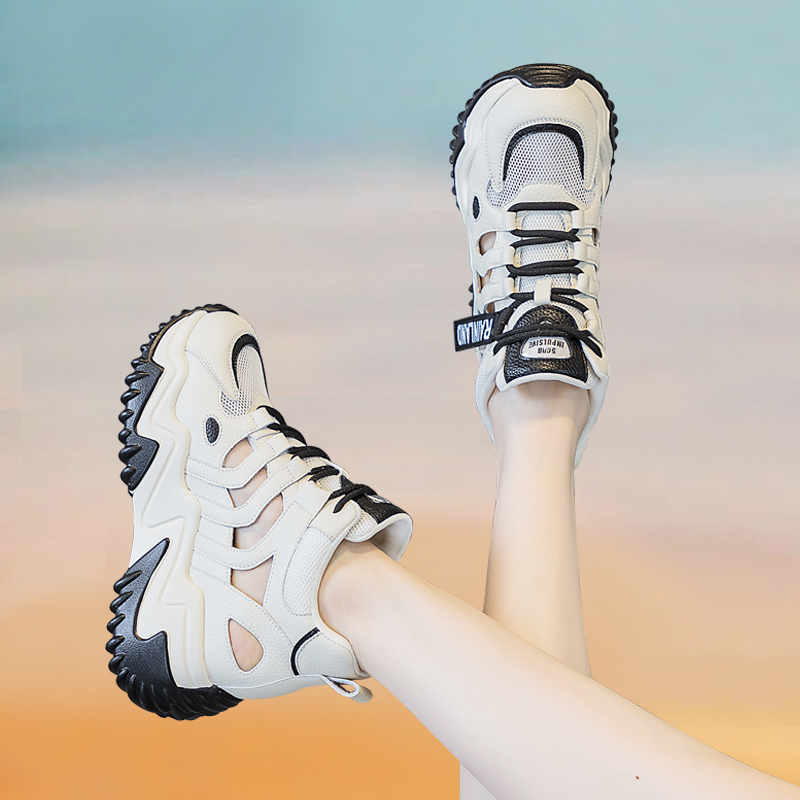 运动休闲小白鞋 真皮厚底老爹鞋 网面透气镂空凉鞋 新款 子 女2025夏季