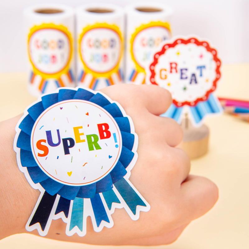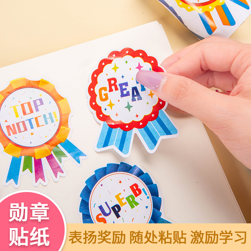 卡通奖励贴纸自粘式 饰纸图案 不干胶优秀奖励贴纸胸章教师用小红花勋章儿童幼儿园宝宝表扬奖章小学生用英语装