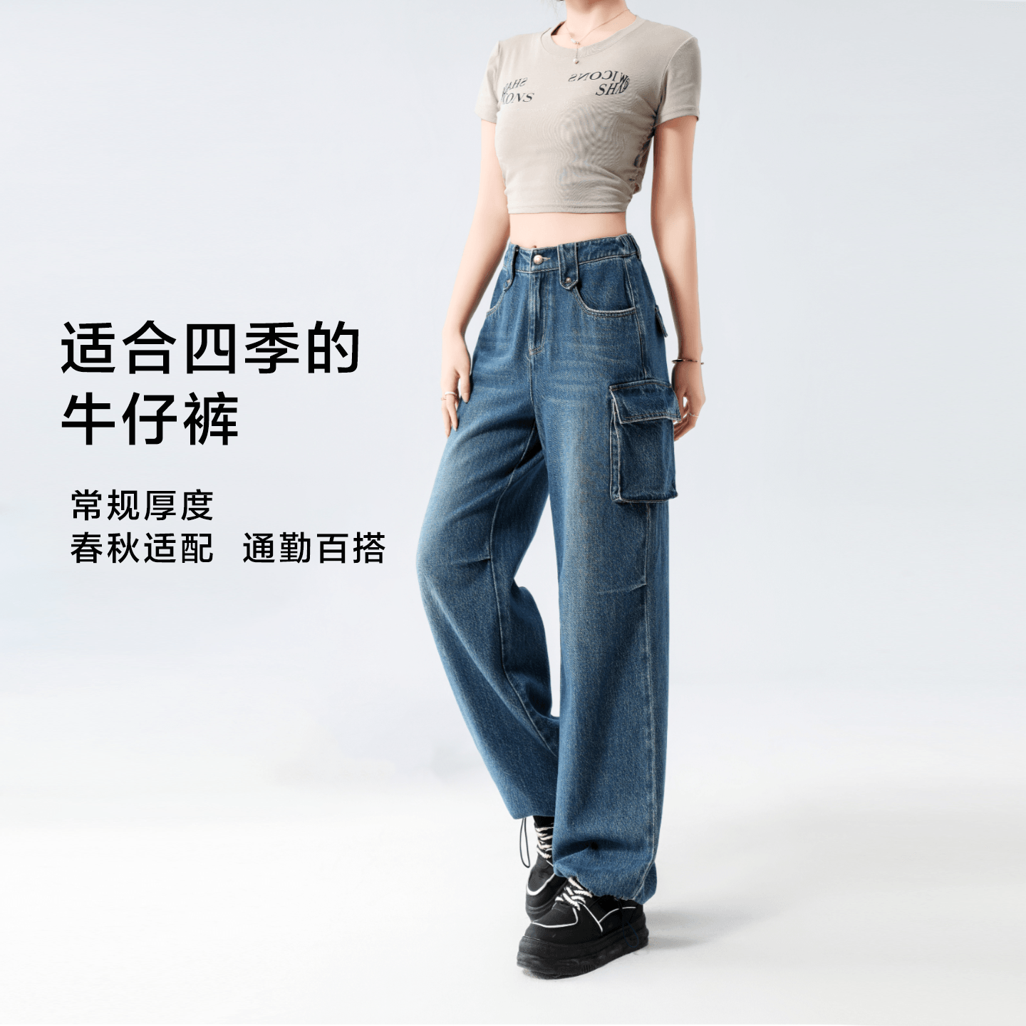 脚弯刀剪裁遮肉显瘦春秋 女天丝棉松紧腰抽绳裤 高腰工装 阔腿牛仔裤