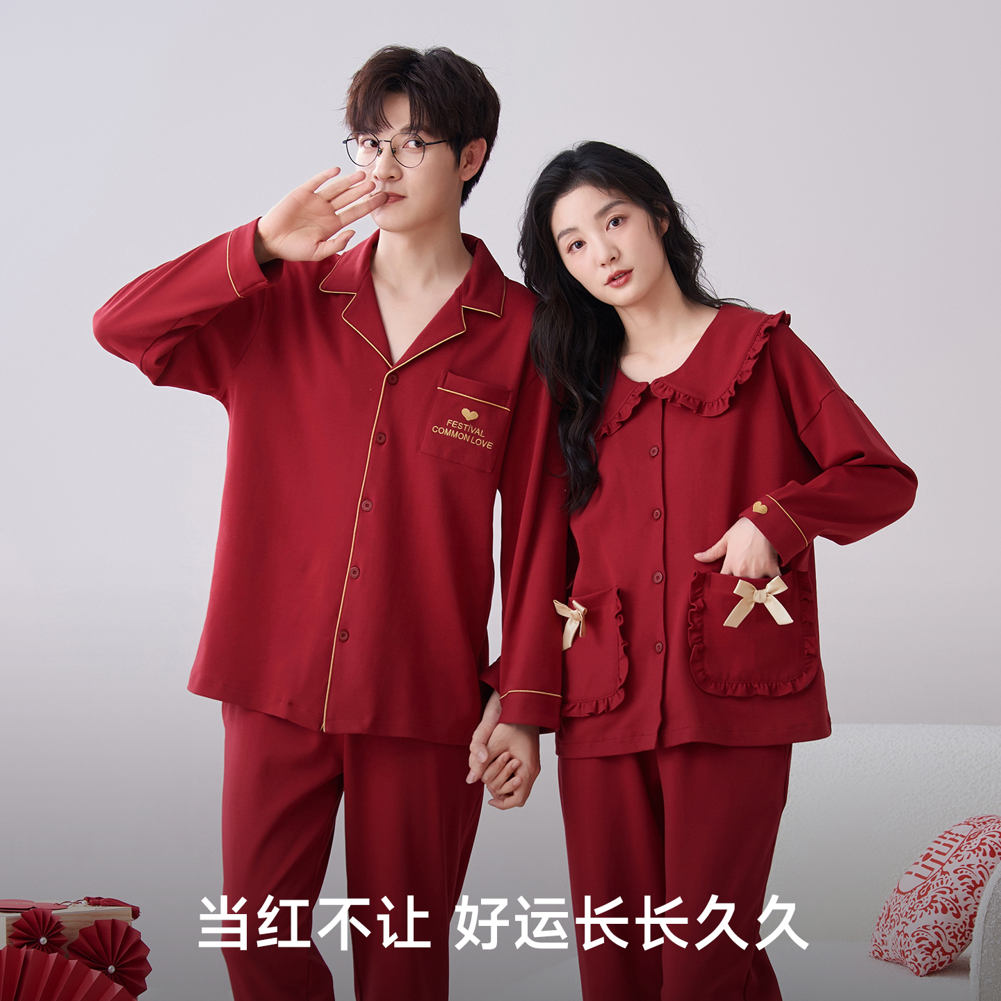 上海故事全棉红色睡衣结婚新婚情侣套装 一男一女纯棉家居服礼盒装