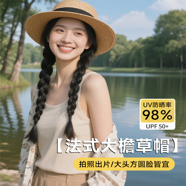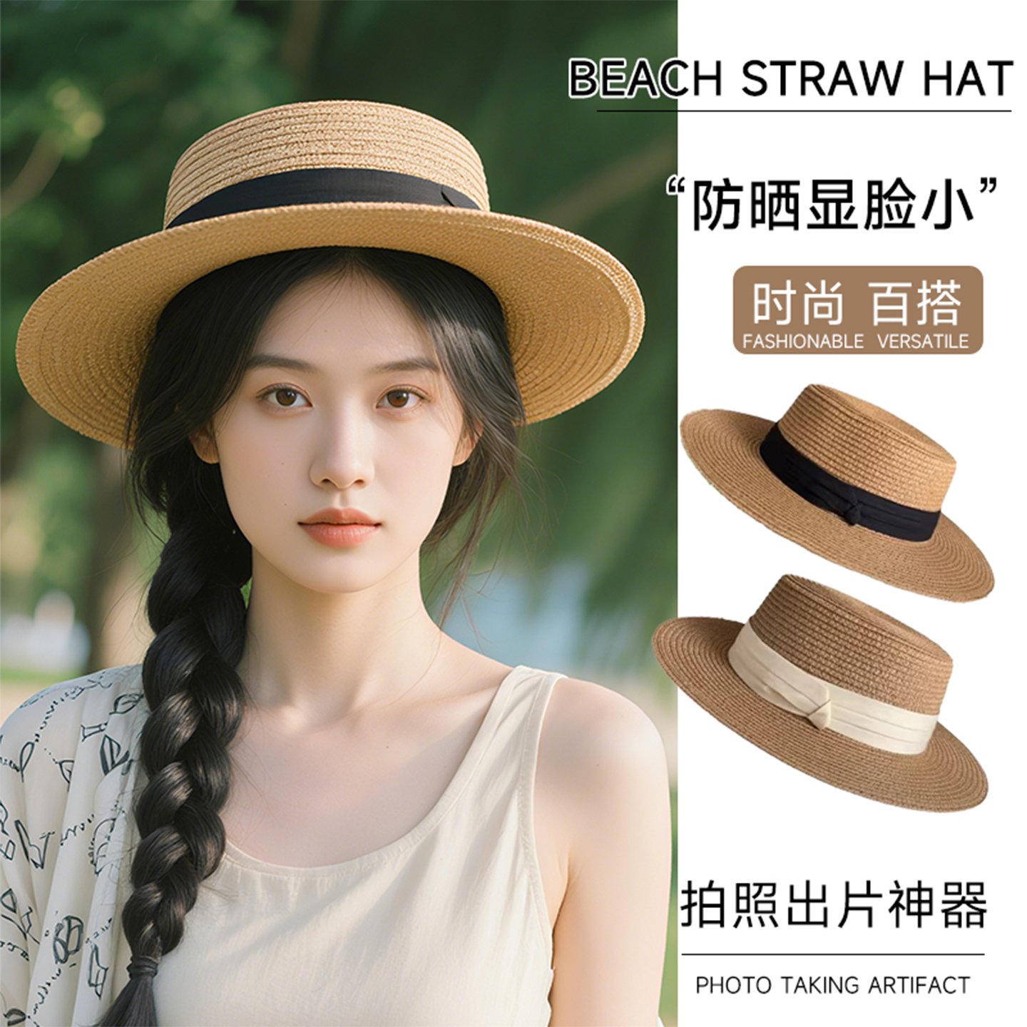 日系平顶草帽女2025年新款 大帽檐遮阳防晒帽海边休闲度假沙滩礼帽