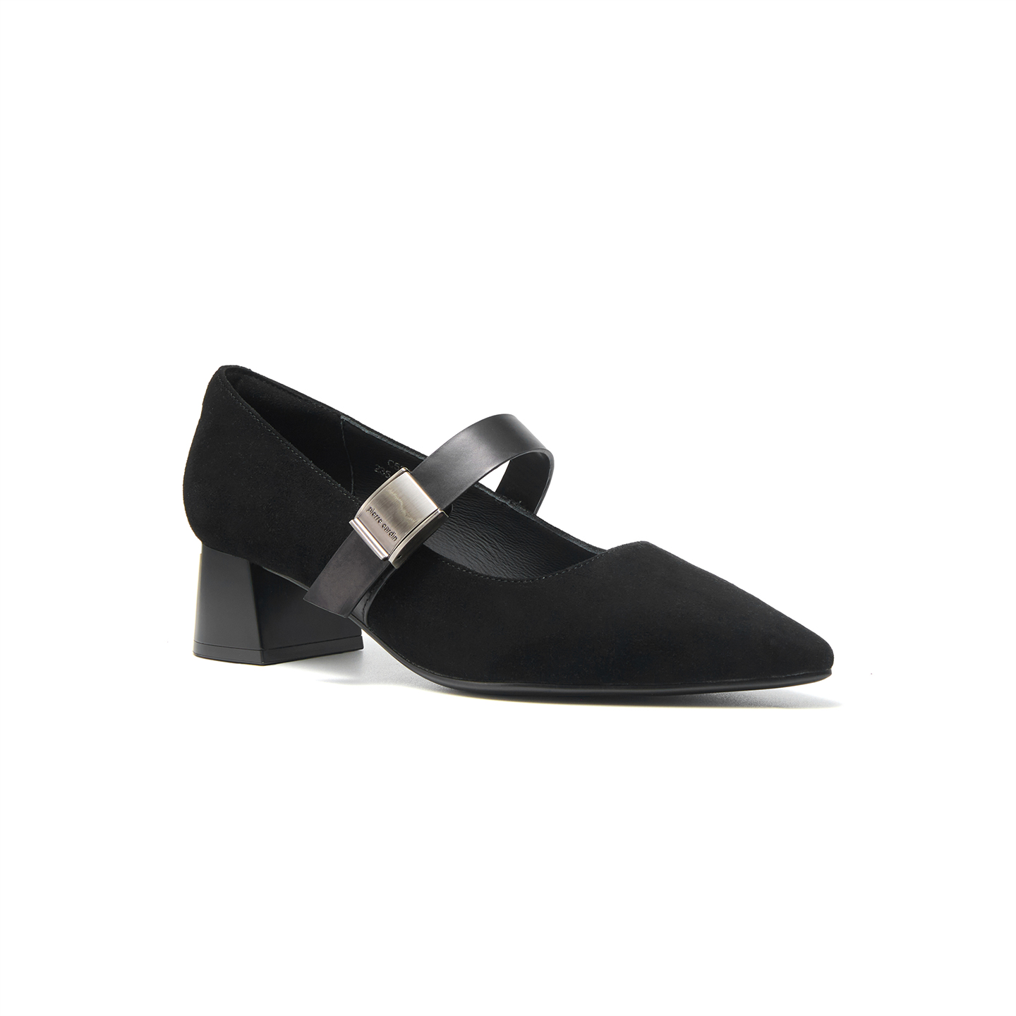 皮尔卡丹女鞋 女 真皮粗跟玛丽珍一字扣带绒面尖头通勤金属浅口单鞋