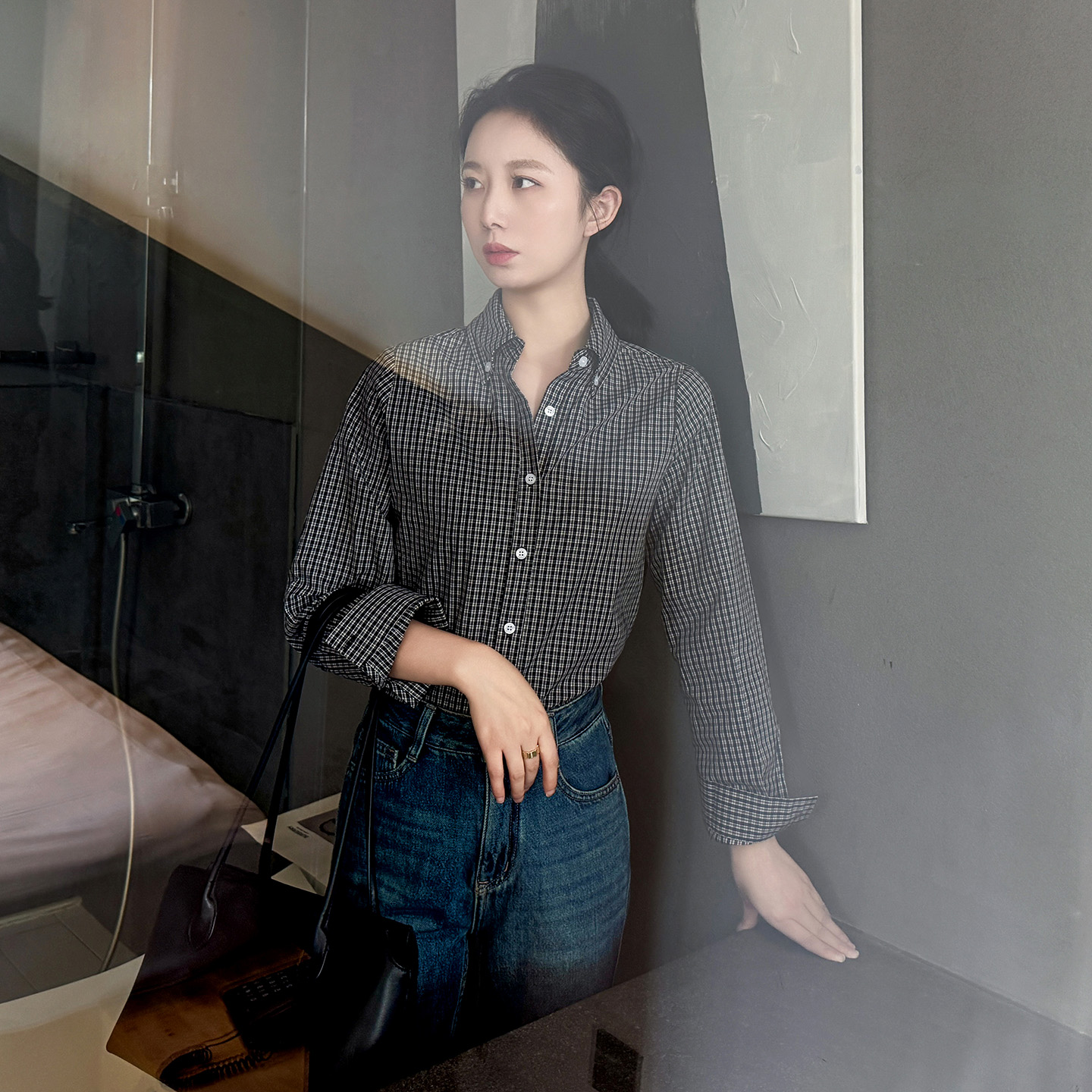 轻奢高级感宽松时尚 女2025新款 正肩纯棉休闲上衣秋 小格子衬衫 长袖