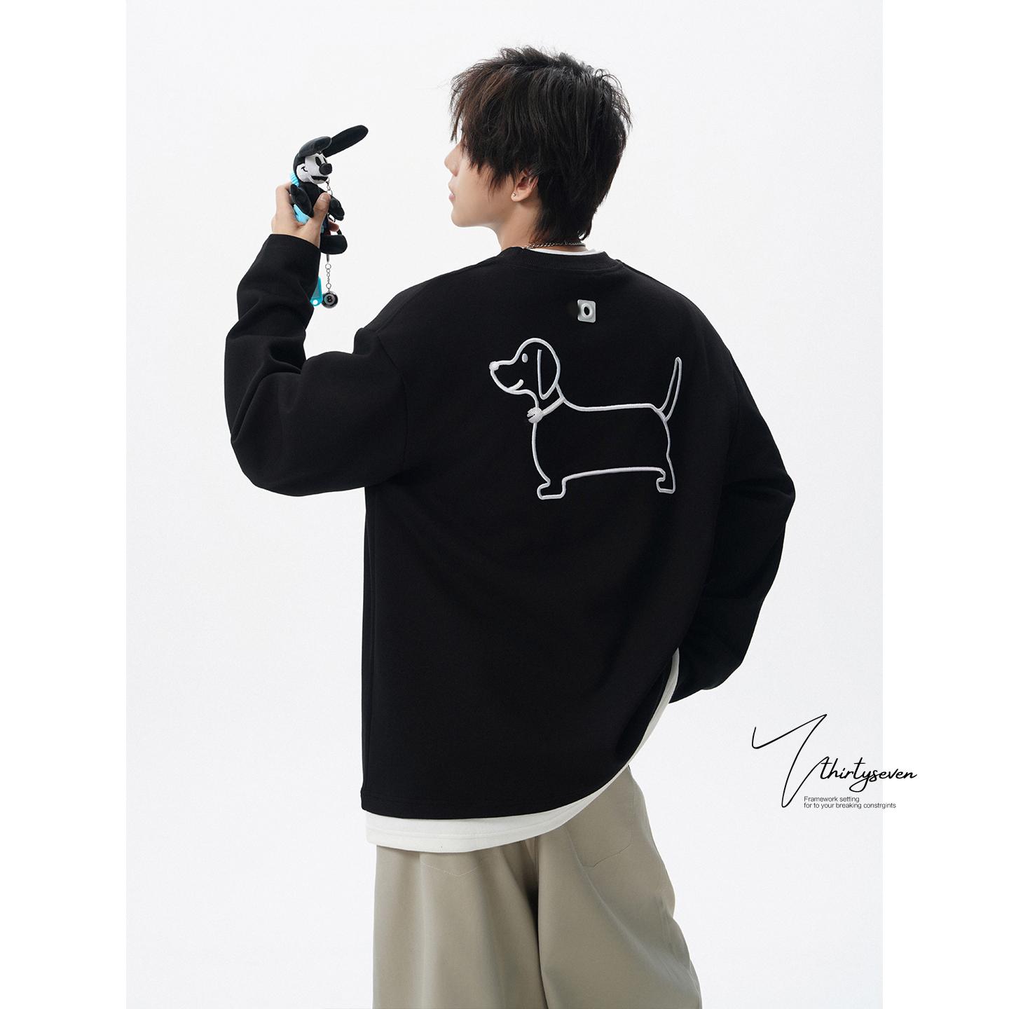 V37美式 青少年复古撞色拼接情侣上衣 重磅小狗刺绣圆领卫衣男秋季