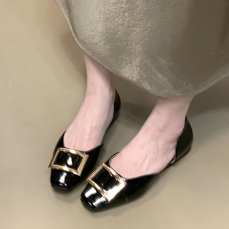 女2025春夏季 平底鞋 新款 气质中空方头凉鞋 漆皮rv方扣法式 浅口单鞋