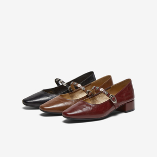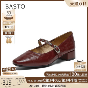 真皮浅口单鞋 新款 子E1T1DCQ5预 女2025秋季 百丽复古粗高跟玛丽珍鞋