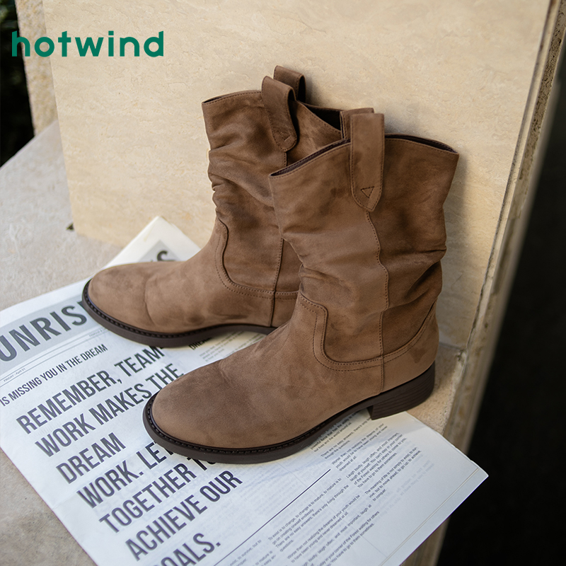 热风都市游牧风西部牛仔靴2025年秋季 美拉德靴子中筒靴堆堆靴女靴