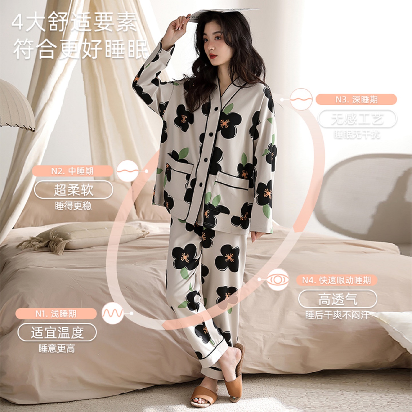 全棉家居服套装 雅鹿纯棉女士睡衣宽松大码 长裤 长袖 妈妈 中老年开衫