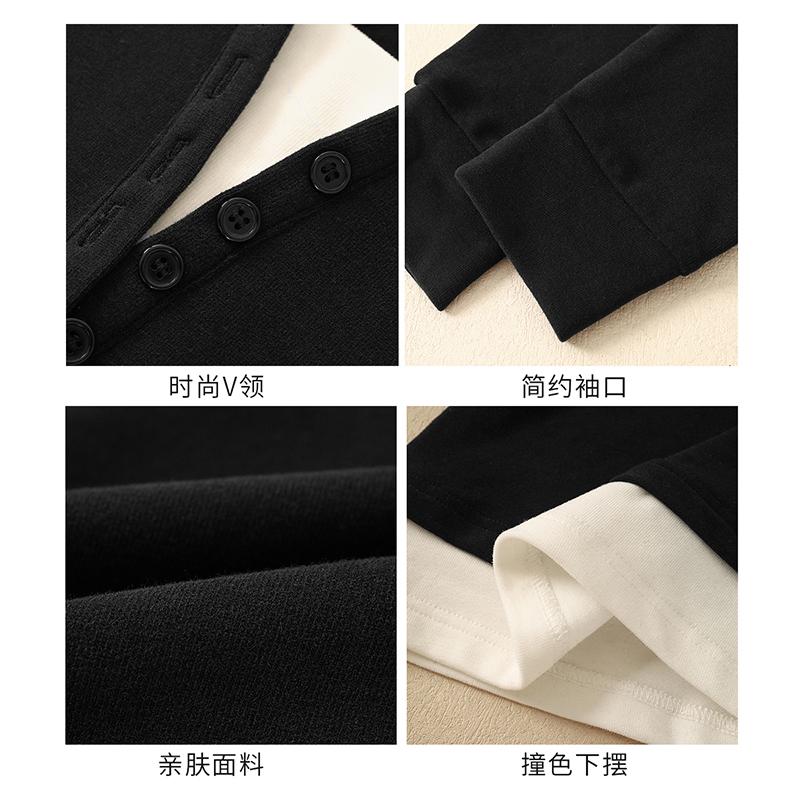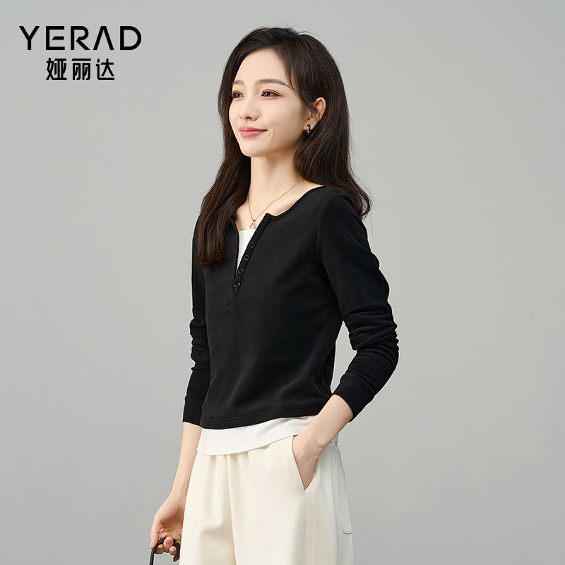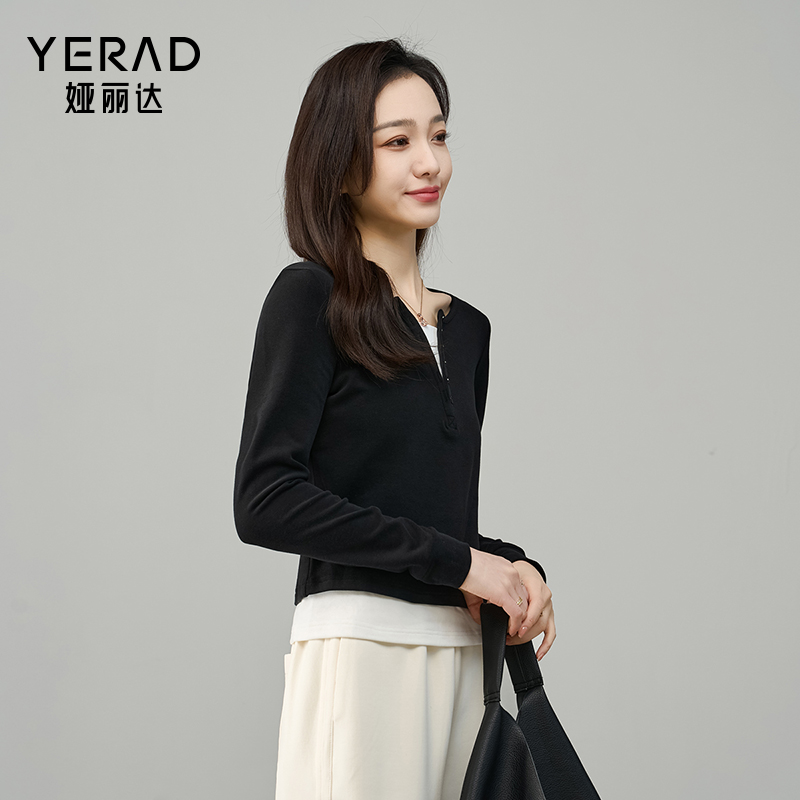长袖 娅丽达设计感小众v领假两件t恤上衣女秋季 修身 打底衫 体恤 新款