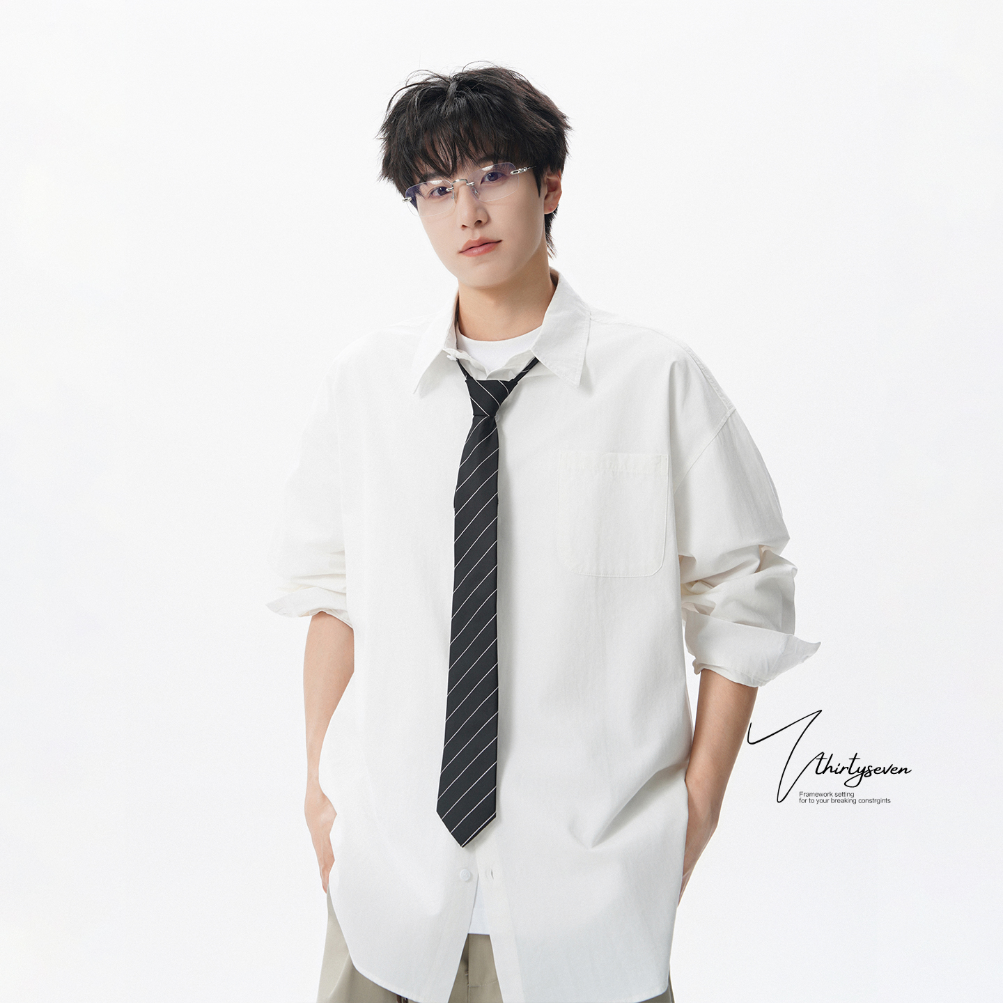男秋高街cleanfit宽松衬衣青少年上衣 衬衫 V37美式 高级感纯白长袖