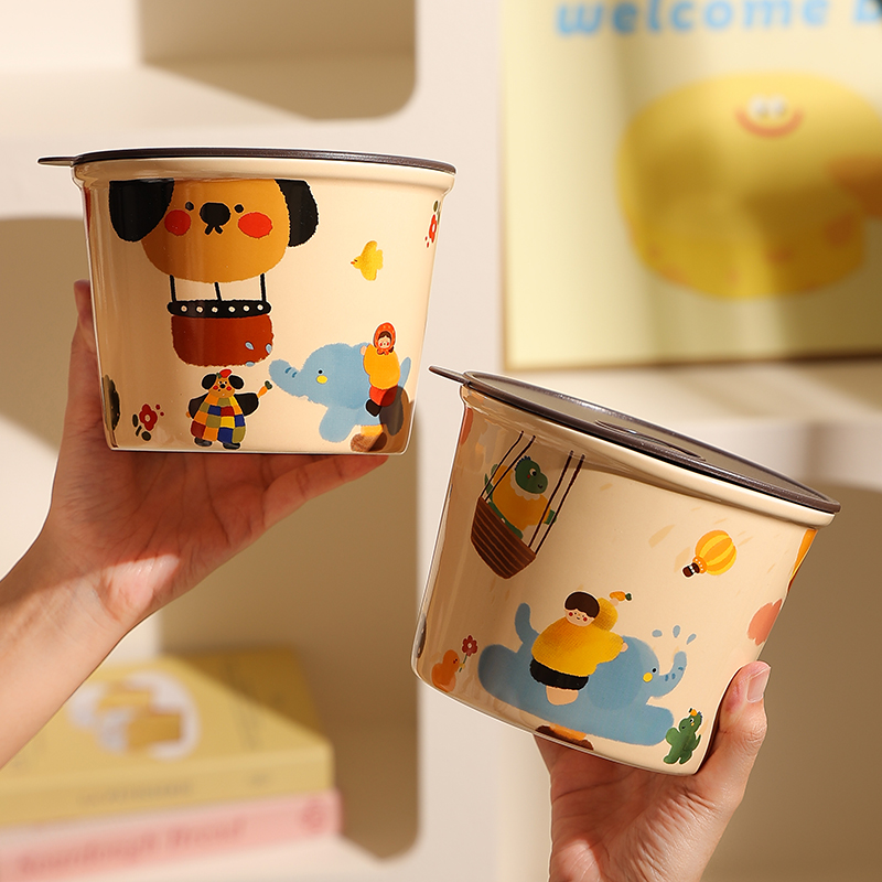 日式 可爱泡面碗带盖密封陶瓷碗大容量卡通饭盒微波炉加热方便面碗