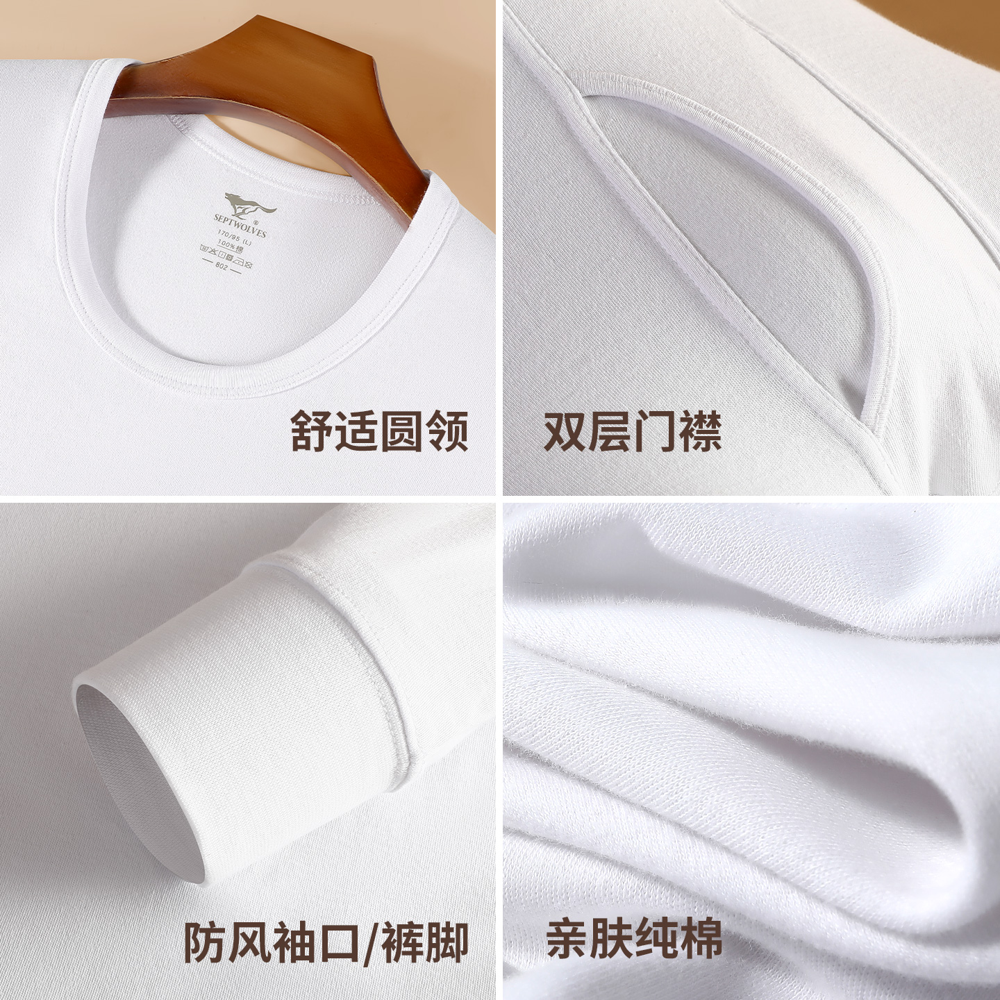 男士 保暖内衣薄款 秋衣秋裤 纯棉全棉2025新款 套装 七匹狼白色棉毛衫
