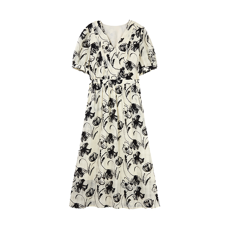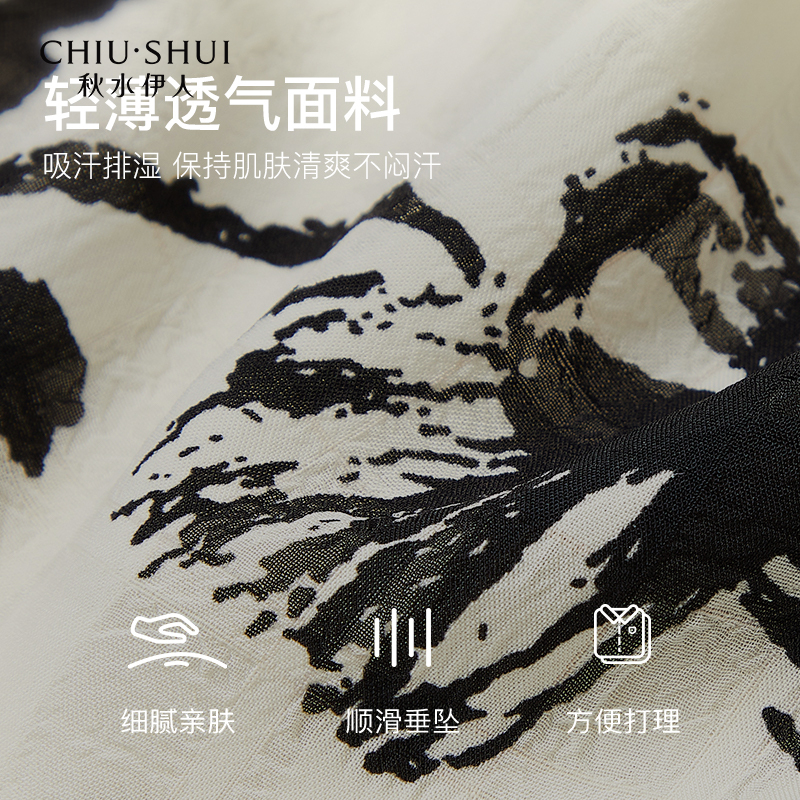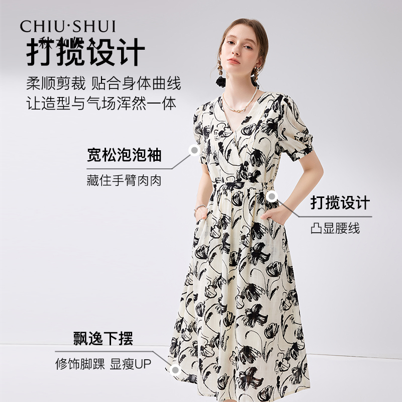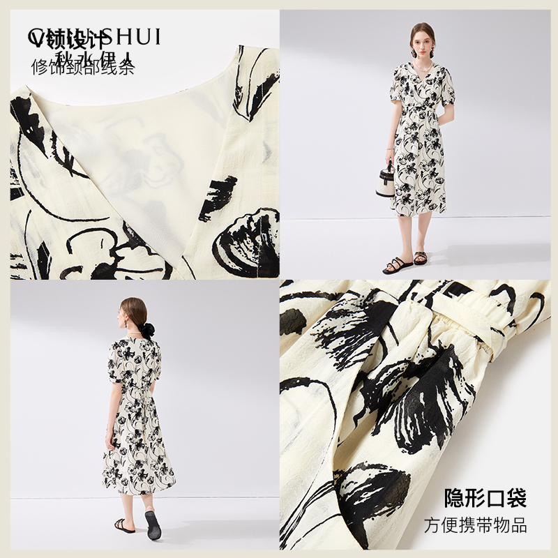 秋水伊人国风水墨印花V领连衣裙2024年夏季 女复古显瘦中长裙 新款