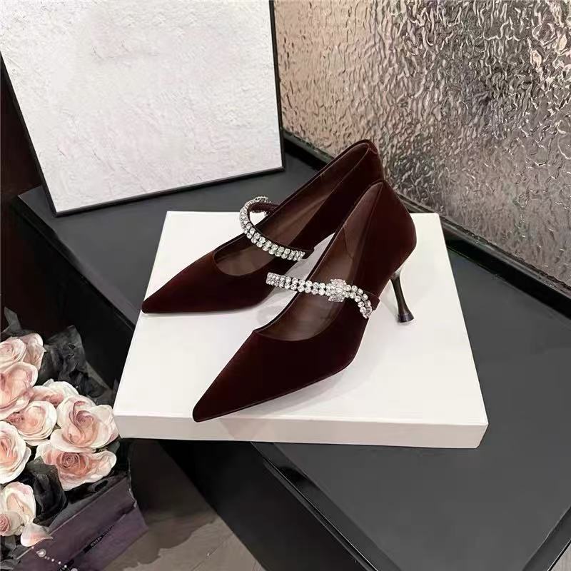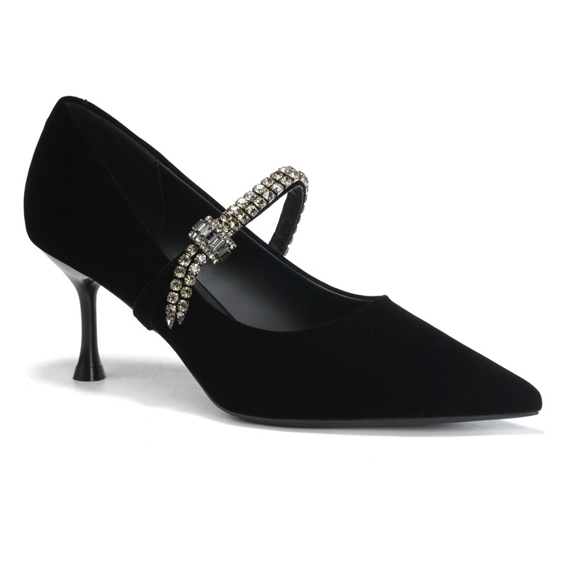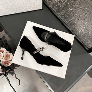 职业工作鞋 女中跟水钻一字扣浅口单鞋 尖头细跟高跟鞋 2025春秋新款