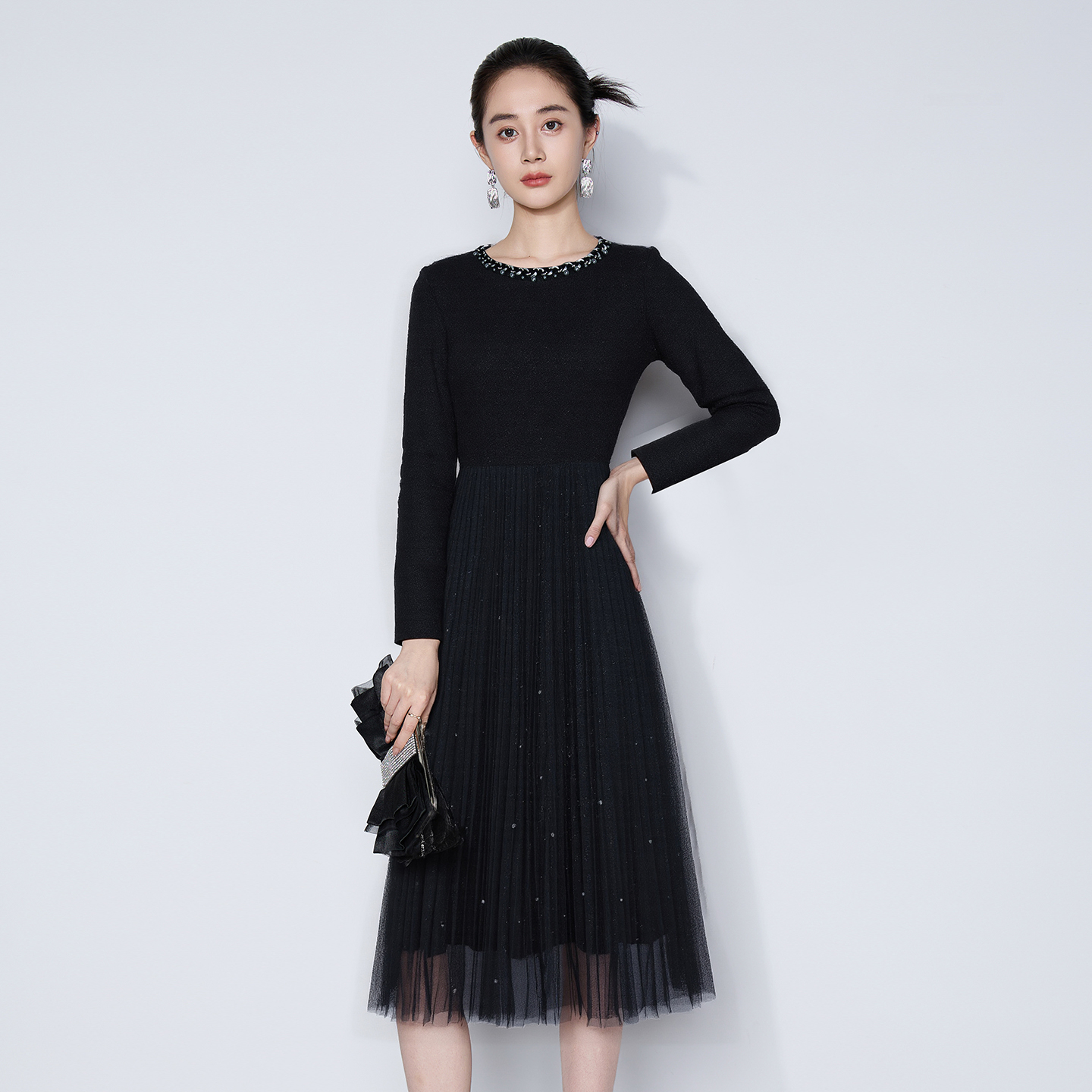 罗衣优雅蝴蝶结大摆连衣裙2025秋新款 黑色内搭针织中长裙子09862