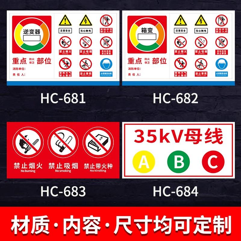 逆变器标识牌箱变警示牌 禁止吸烟严禁烟火注意安全重点防火部位标志定制 35KV母线ABC提示牌户外反光膜铝板