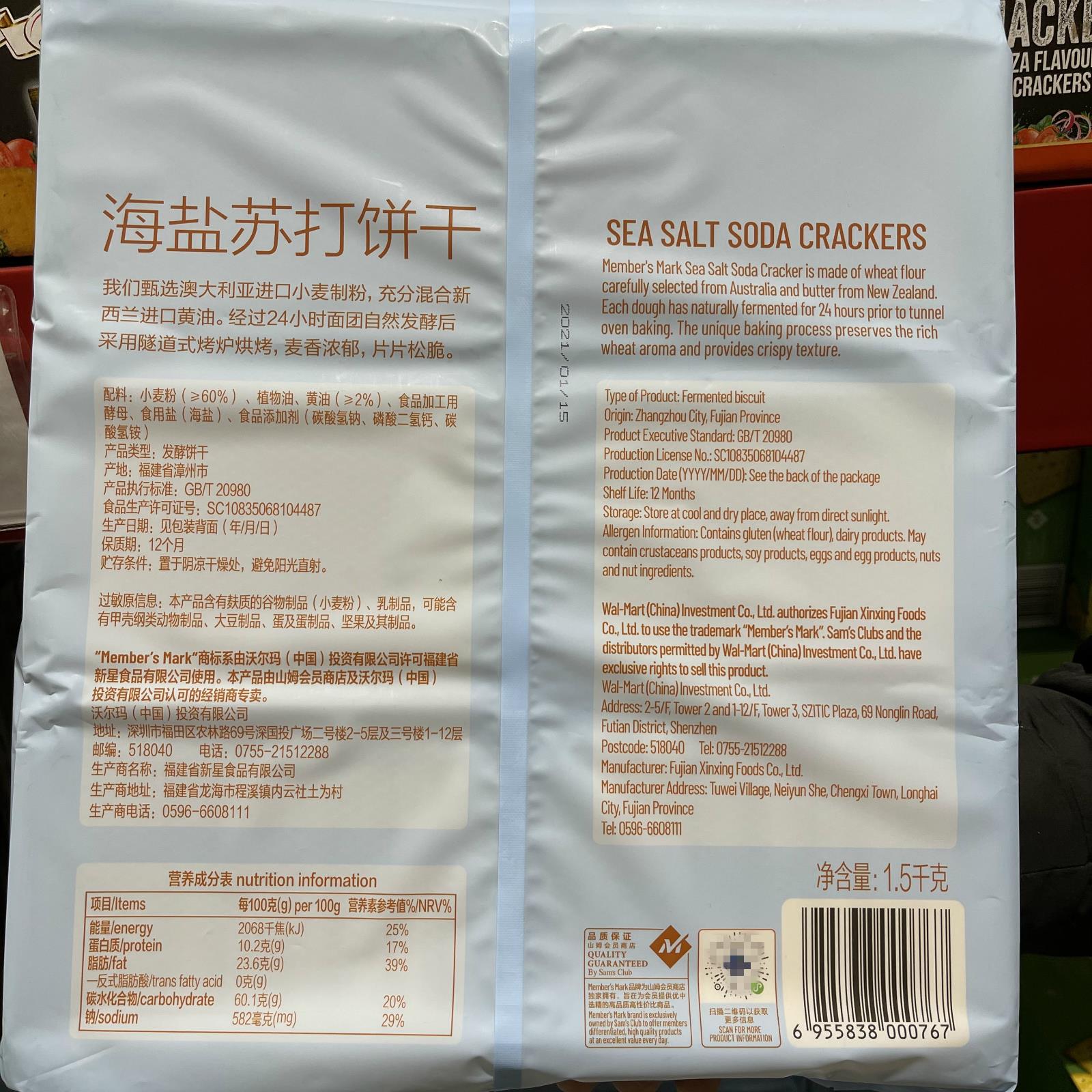 Mark海盐苏打饼干1.5kg咸味无糖精休闲零食点心 山姆代购 Member