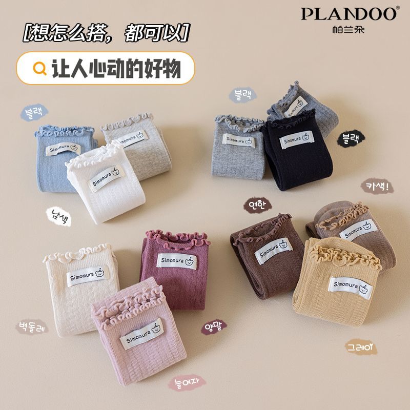 帕兰朵女童袜子秋季 棉质儿童韩系花边中筒袜直贴布标木耳边堆堆袜