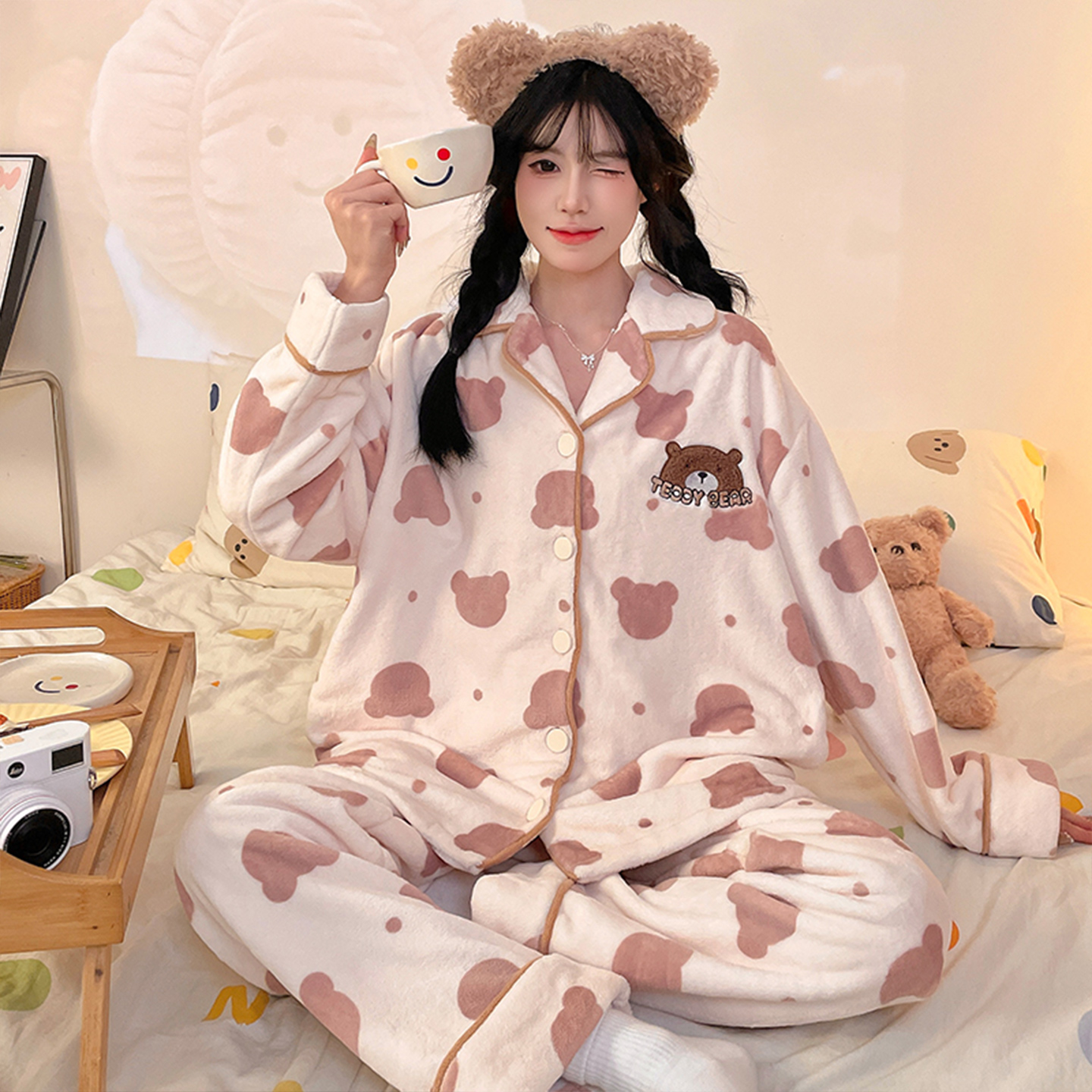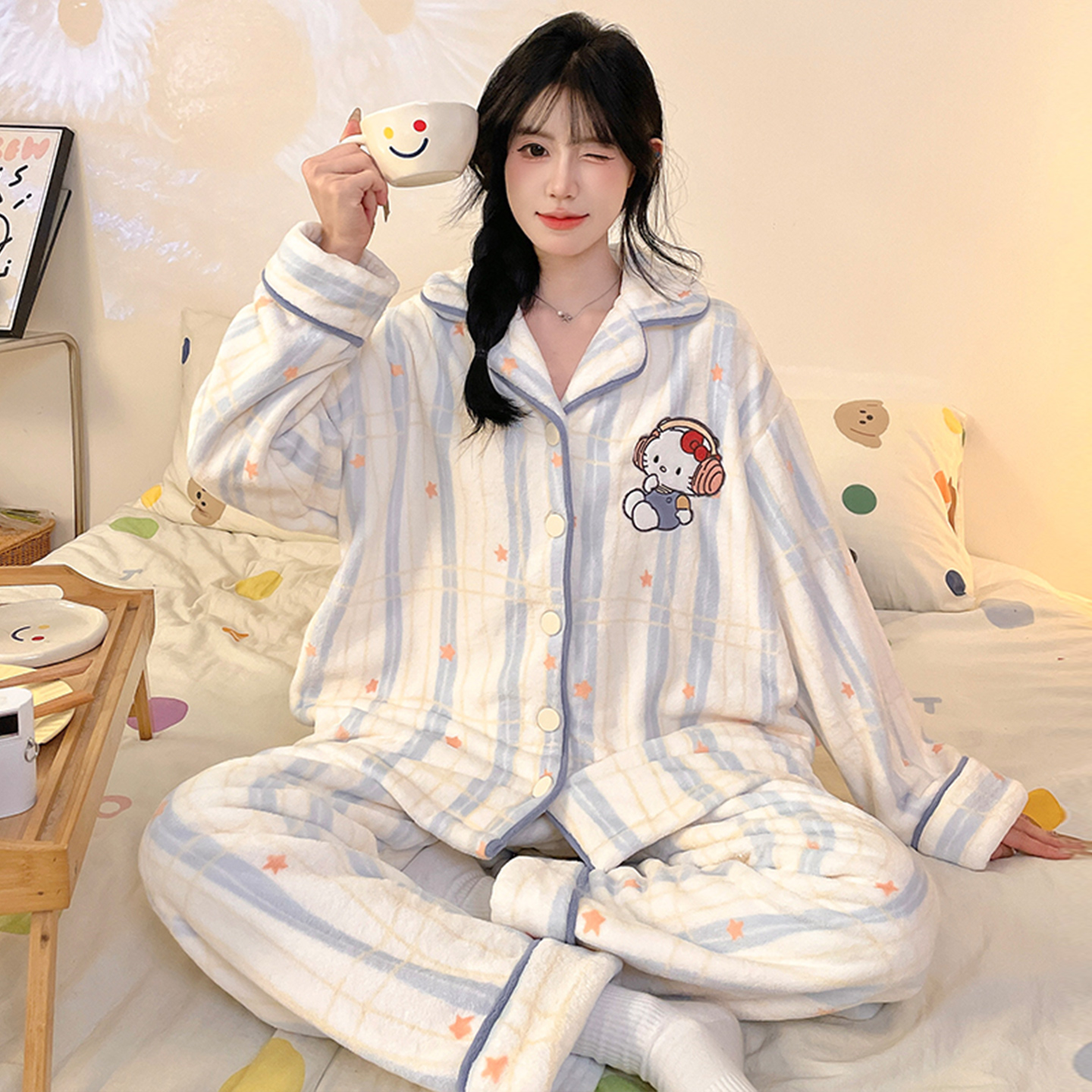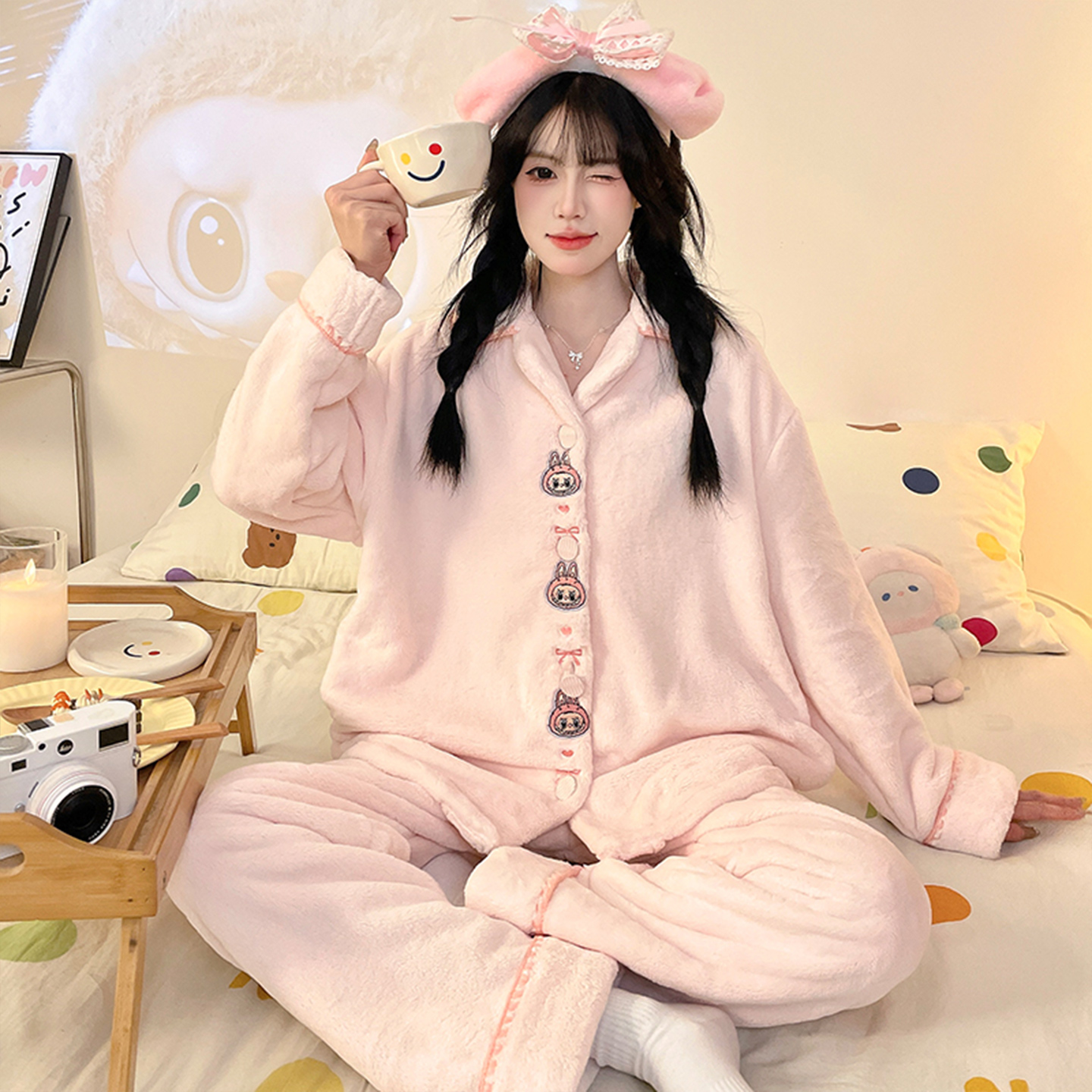 秋冬季 套装 新款 开衫 冬天加绒加厚法兰绒家居服 长袖 珊瑚绒睡衣女款