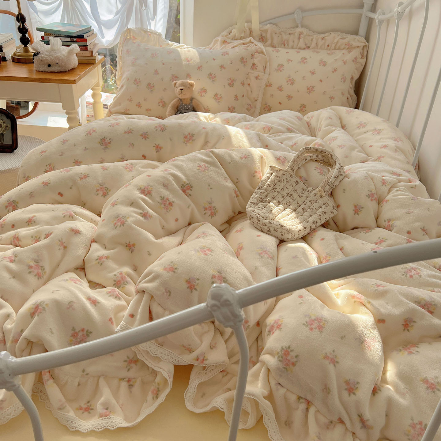 奶油风花边四件套牛奶绒加厚保暖2025新款 珊瑚法兰绒被套床单笠三