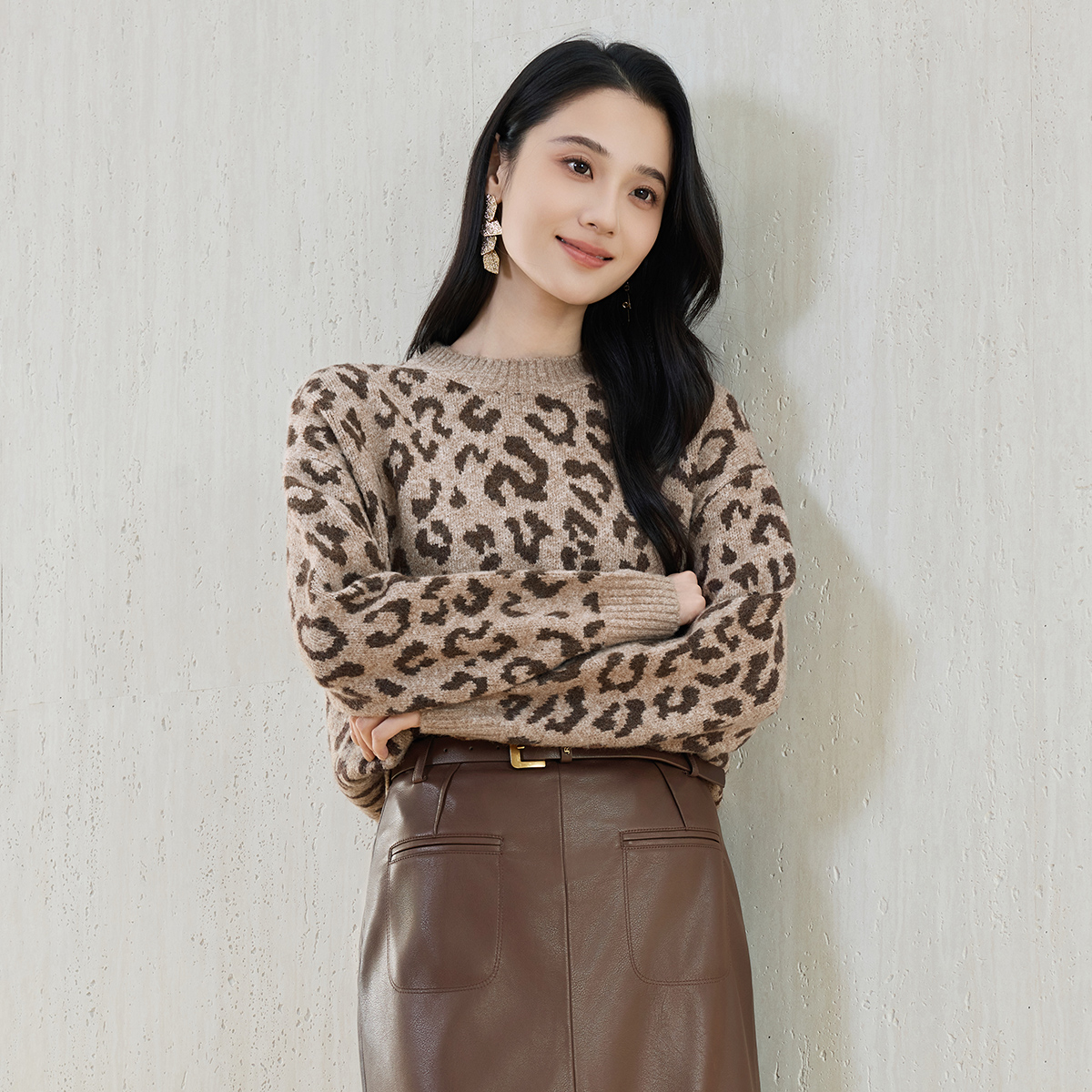 圆领豹纹提花落肩长袖 新款 上衣气质慵懒 女2025年冬季 佳人苑针织衫