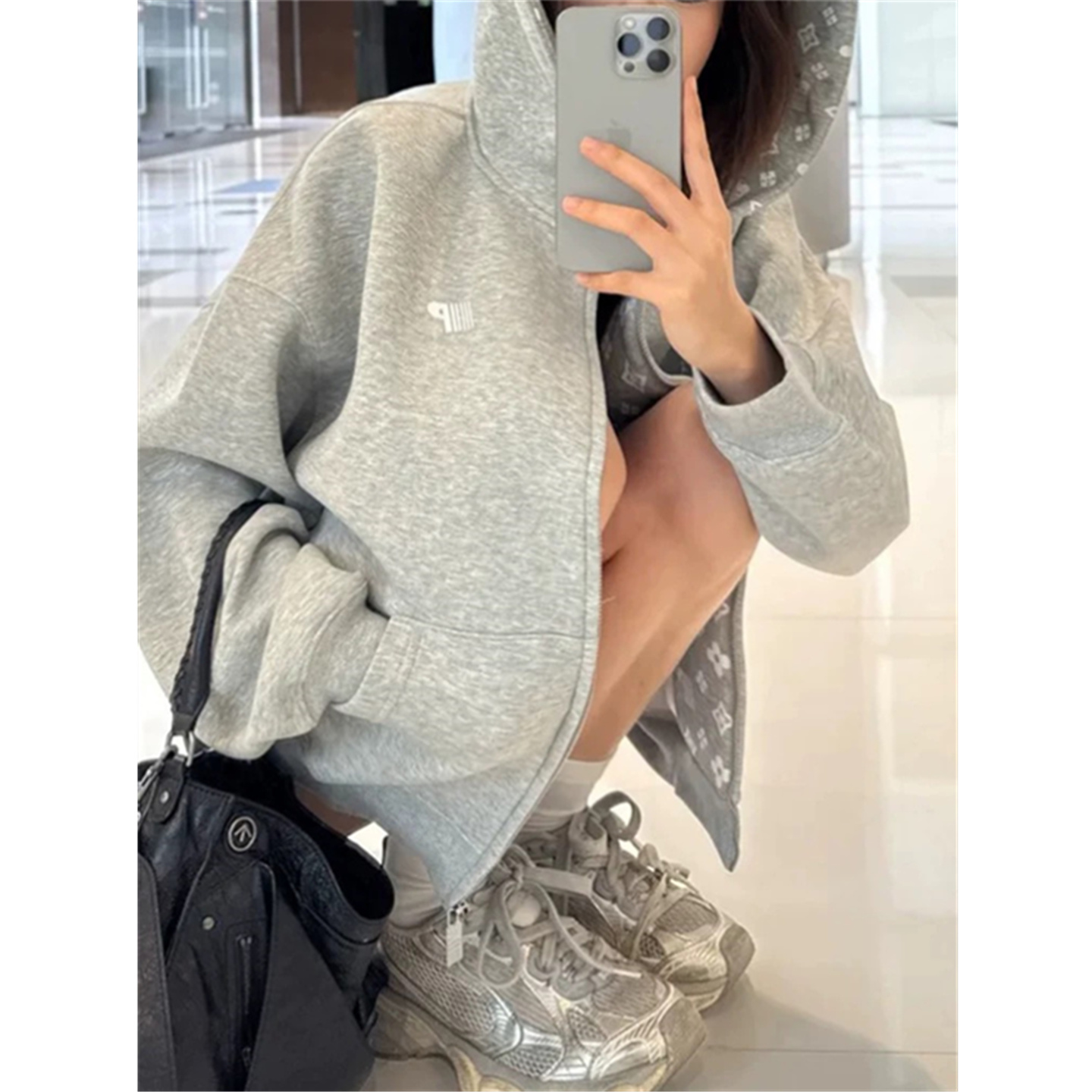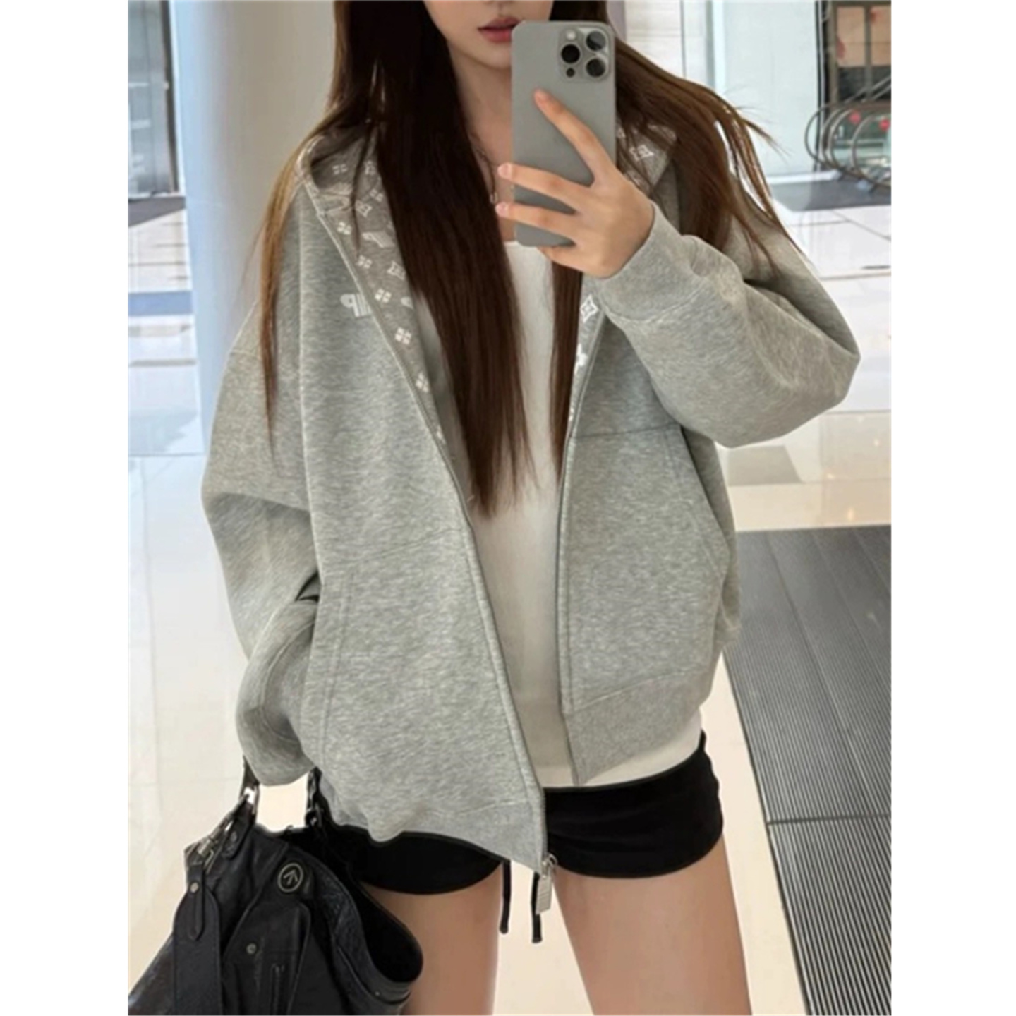 外套宽松慵懒风开衫 美式 复古潮牌印花连帽卫衣女春秋oversize薄款