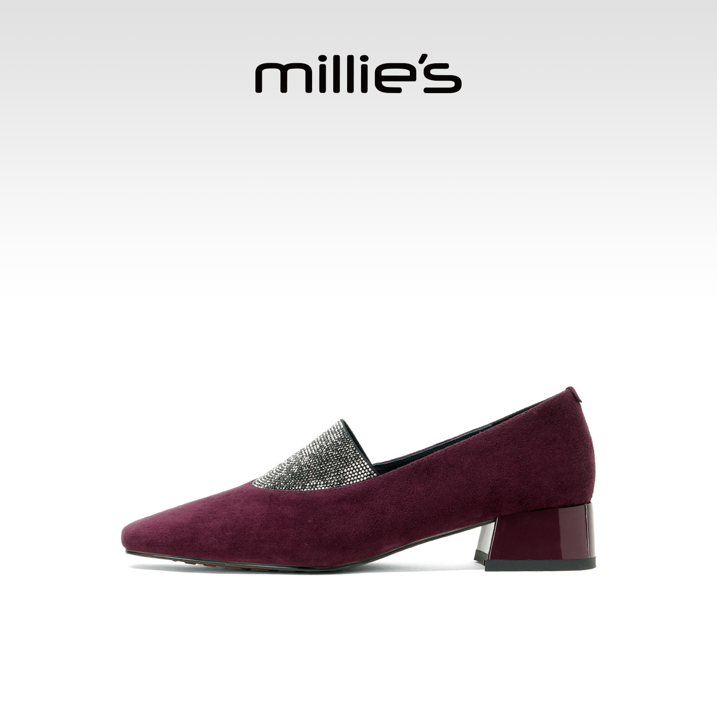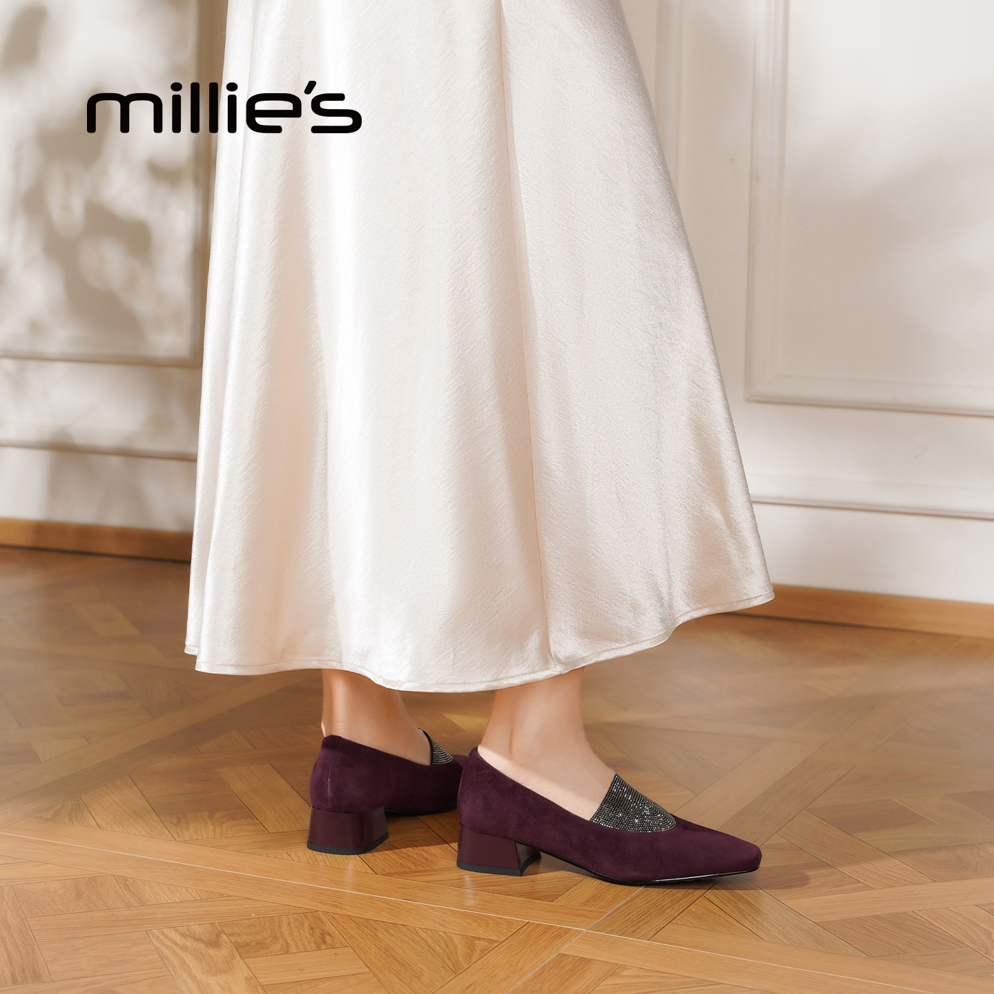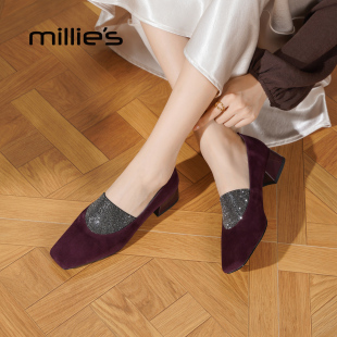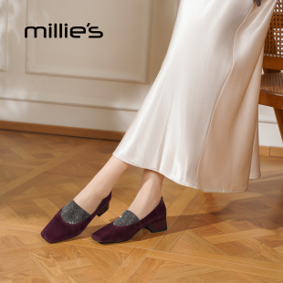 方头粗跟一脚蹬水钻工作单鞋 MILLIE 女2025新款 妙丽通勤乐福鞋