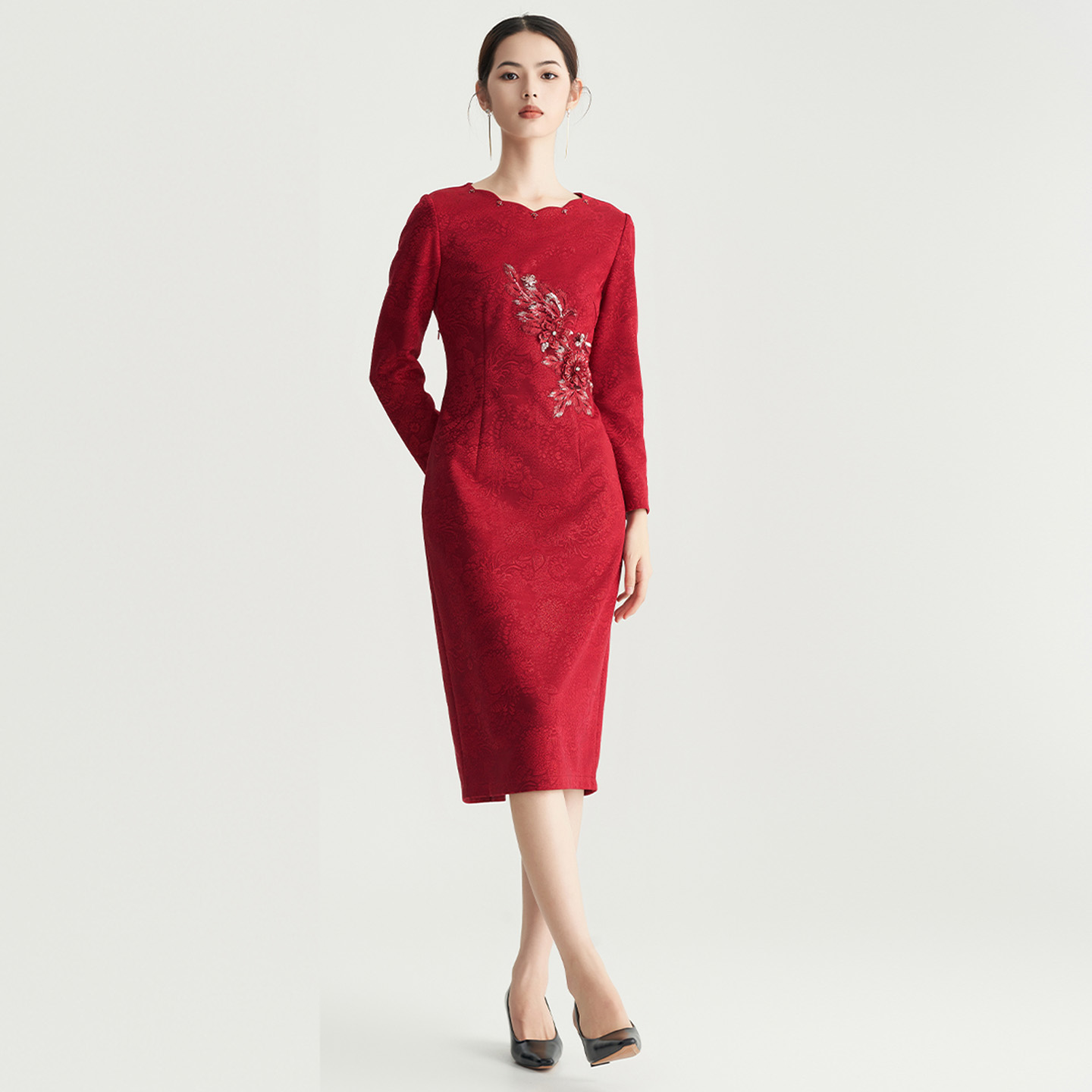 断码 盘扣旗袍领连衣裙收腰长袖 秒杀 新中式 缎面气质 太平鸟女装