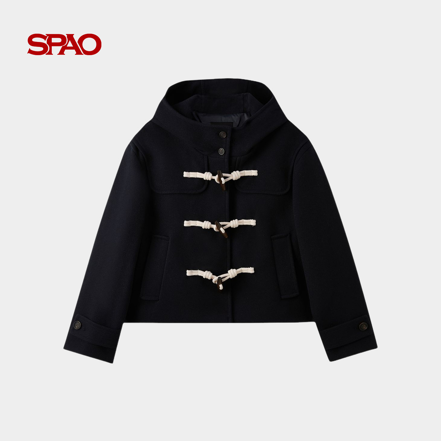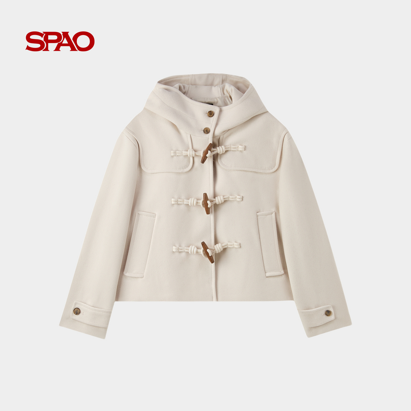 女士气质牛角扣连帽短款 新品 毛呢大衣外套 2025年冬季 SPAO韩国同款