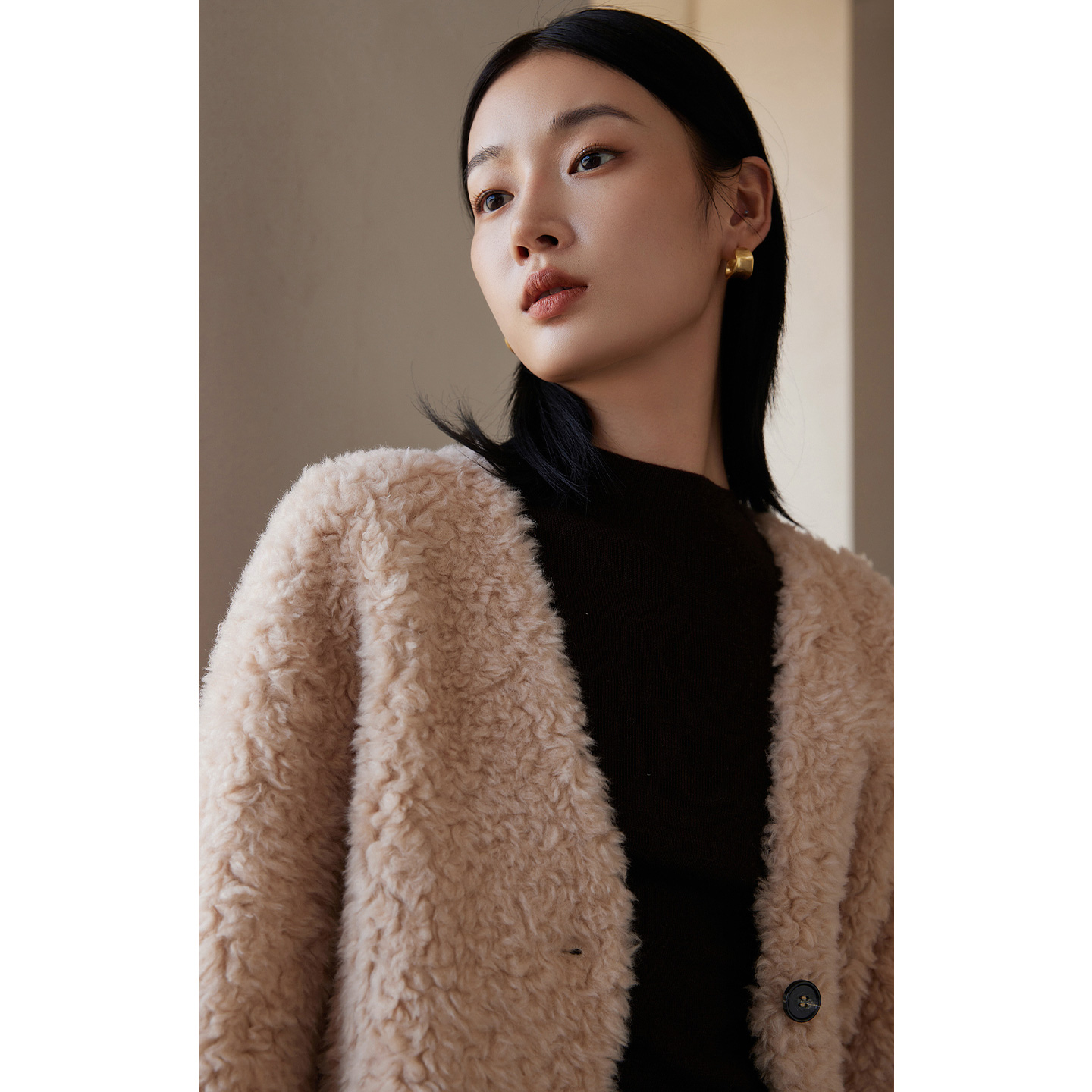 HM女装 立领宽松毛茸宽松附侧唇袋短大衣1248383 毛呢外套冬季