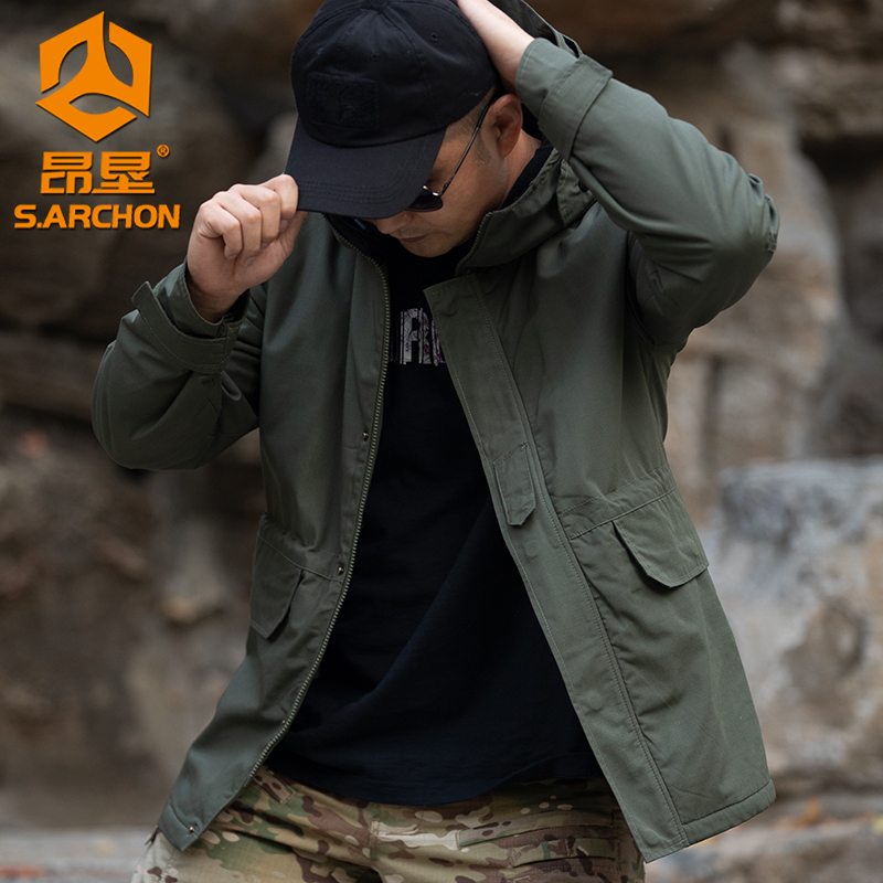昂垦风衣外套男秋冬中长款 户外防风多口袋耐磨连帽冲锋衣战术夹克