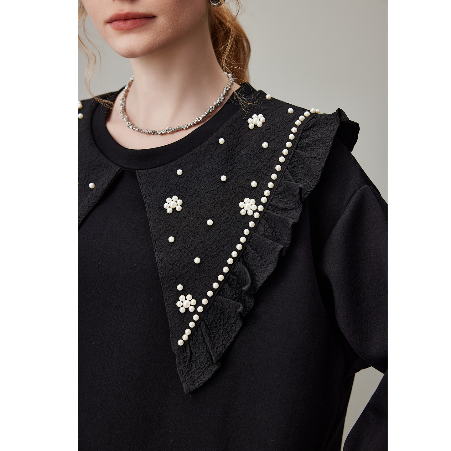 收腰显瘦连衣裙短裙春 新款 阔色针织长袖 拼接花苞小黑裙女2025秋季