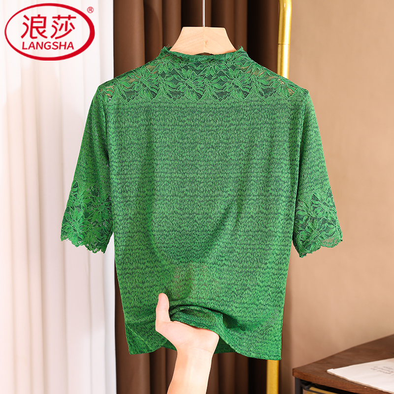 新款 中袖 洋气半高领蕾丝衫 百搭打底女装 纯色上衣 女五分袖 浪莎秋季