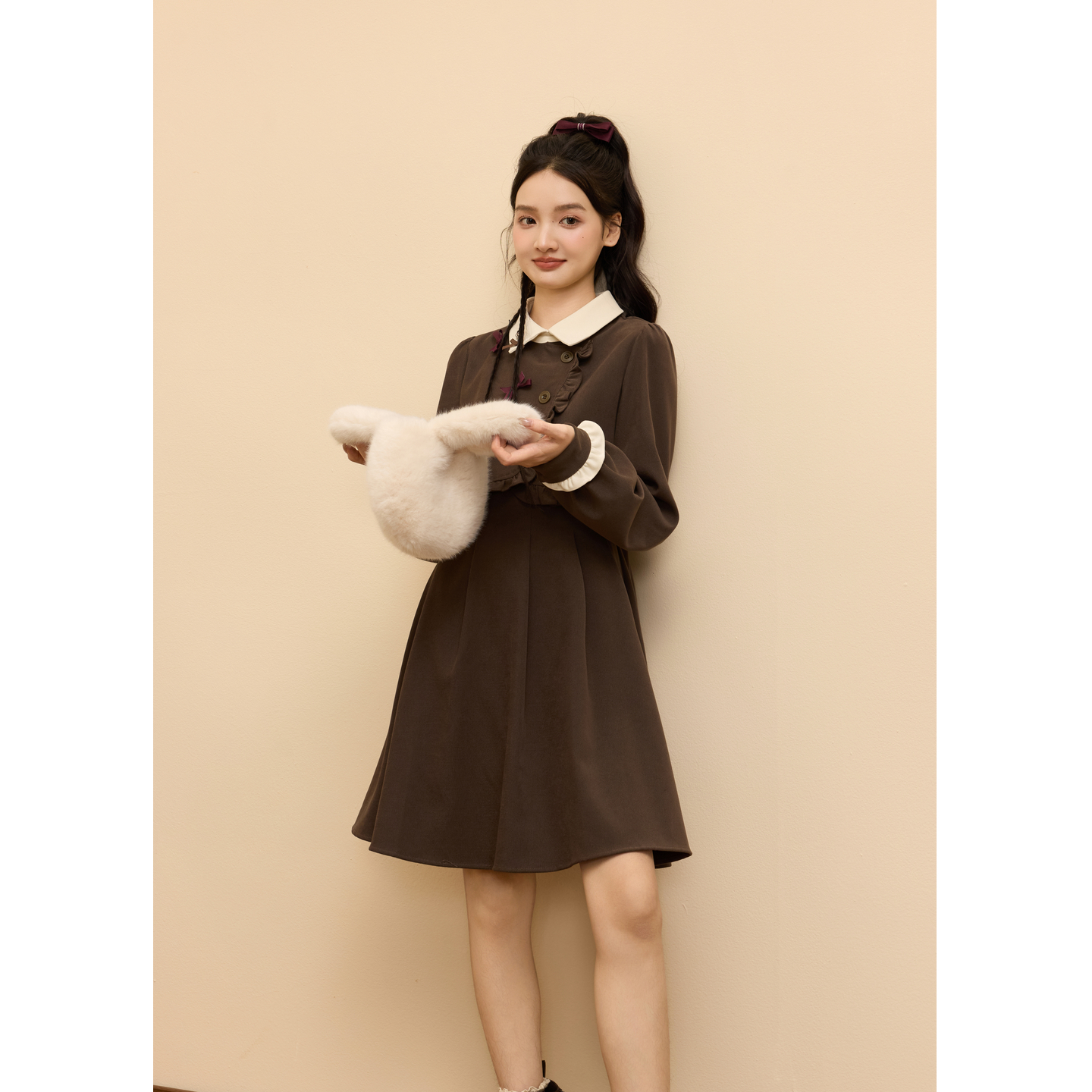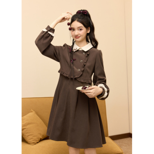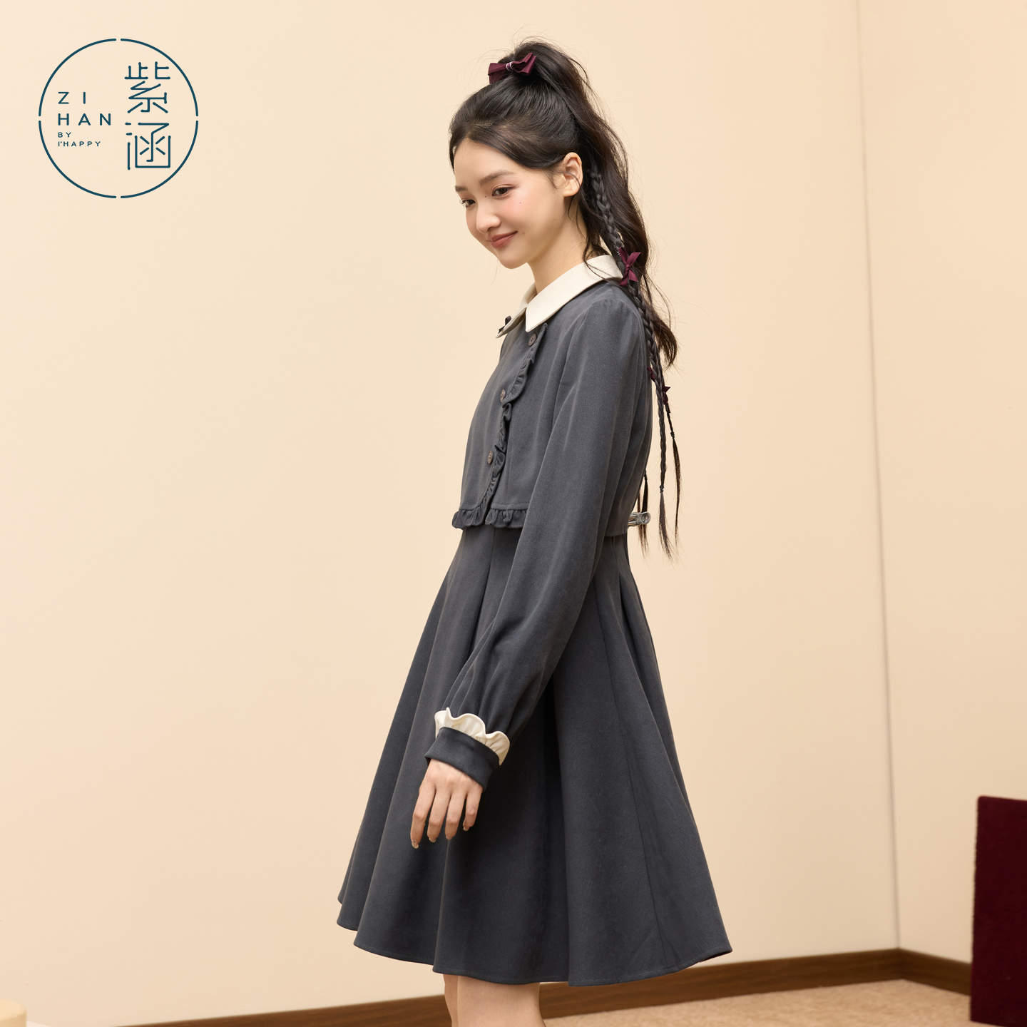 a字裙 复古撞色翻领木耳边长袖 紫涵假两件连衣裙女2025年冬季 新款