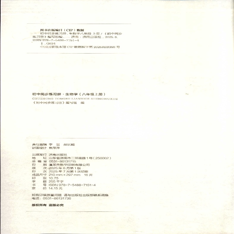 2025秋六三制初中同步练习册 生物学8八年级上配济南版