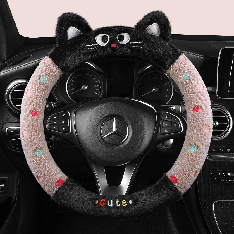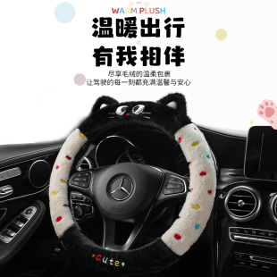 波点猫咪汽车方向盘套冬季 防滑可爱卡通车把套 短毛绒保护套女士款