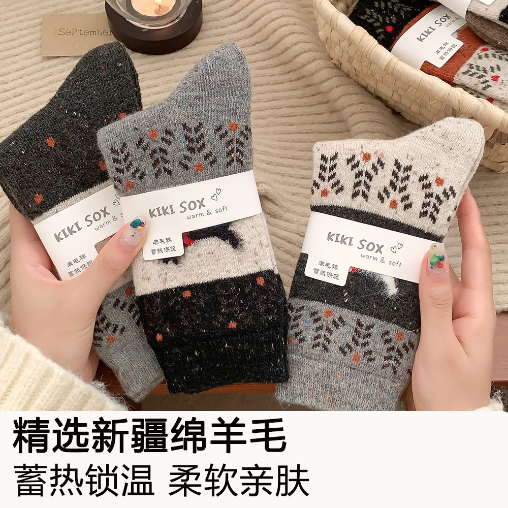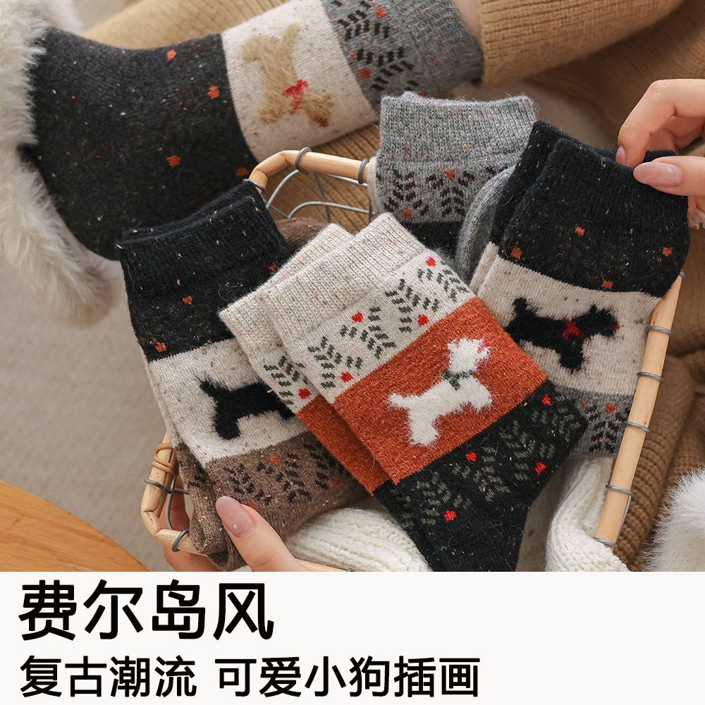 秋冬卡通拼色小狗女袜保暖羊毛加厚中筒袜复古ins韩版 氛围堆堆袜