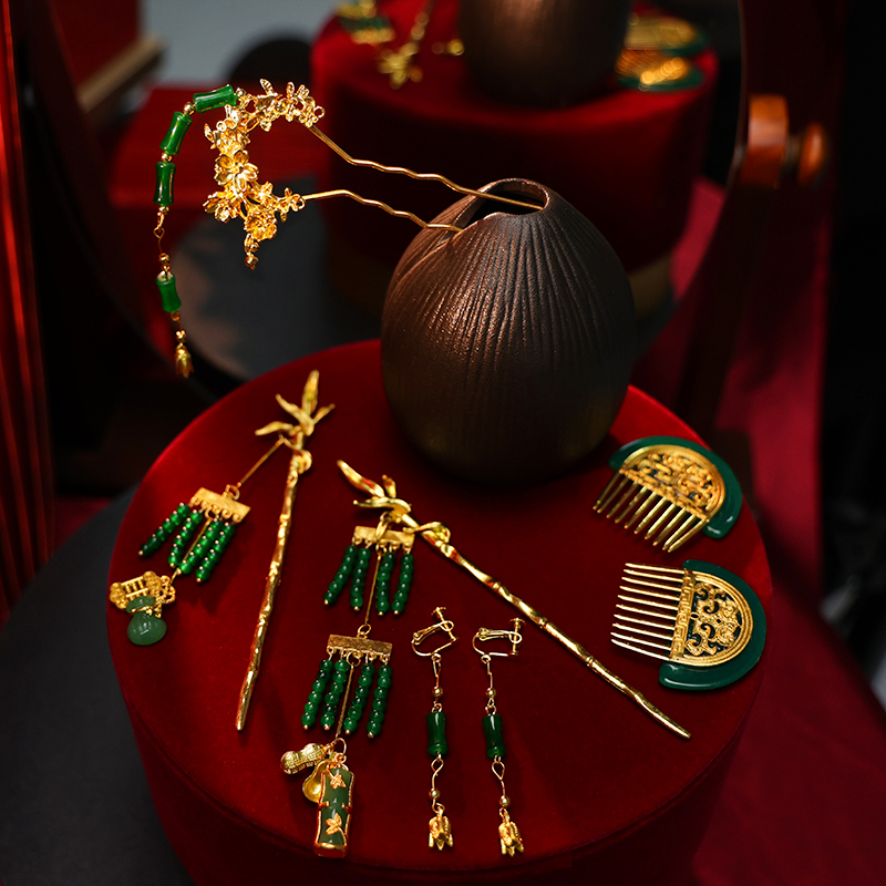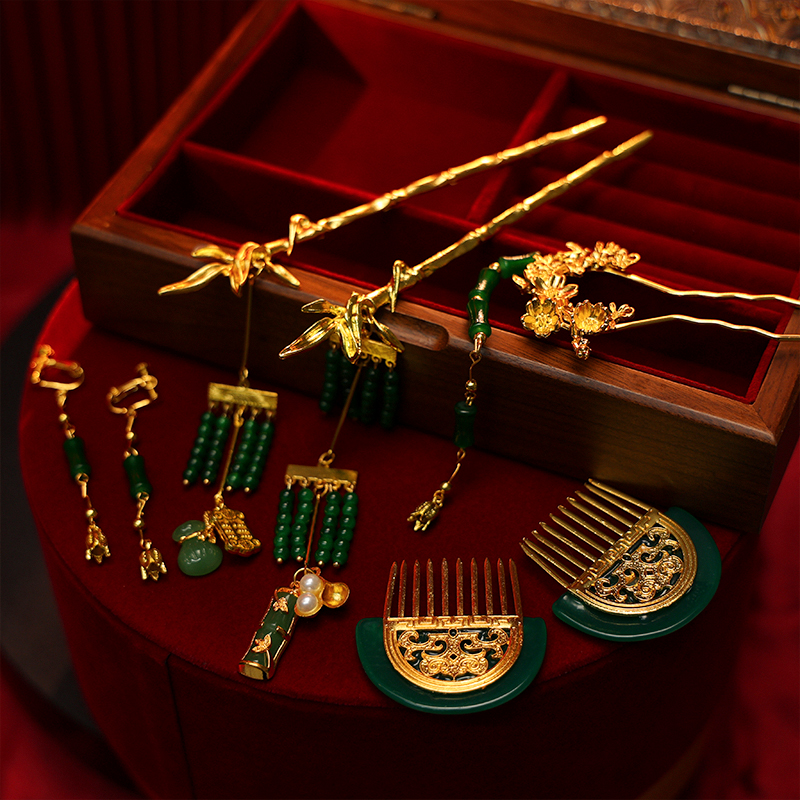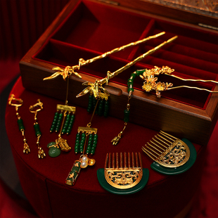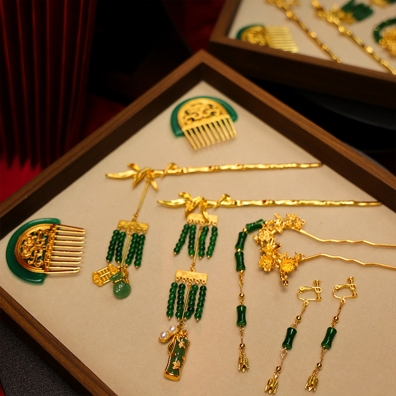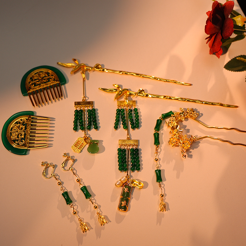 新娘头饰竹节发簪新中式 高级感绿色竹叶串珠发钗秀禾服旗袍配饰品