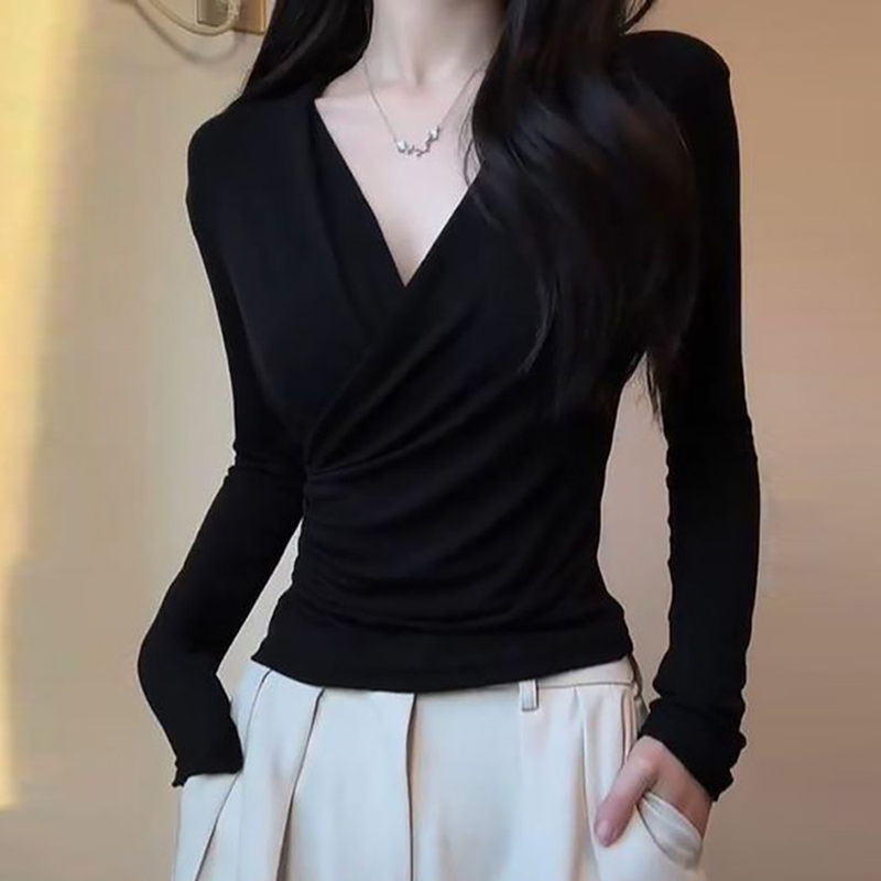 内搭打底衫 辣妹抽褶收腰长袖 韩版 修身 正肩V领纯欲上衣 T恤女春秋季