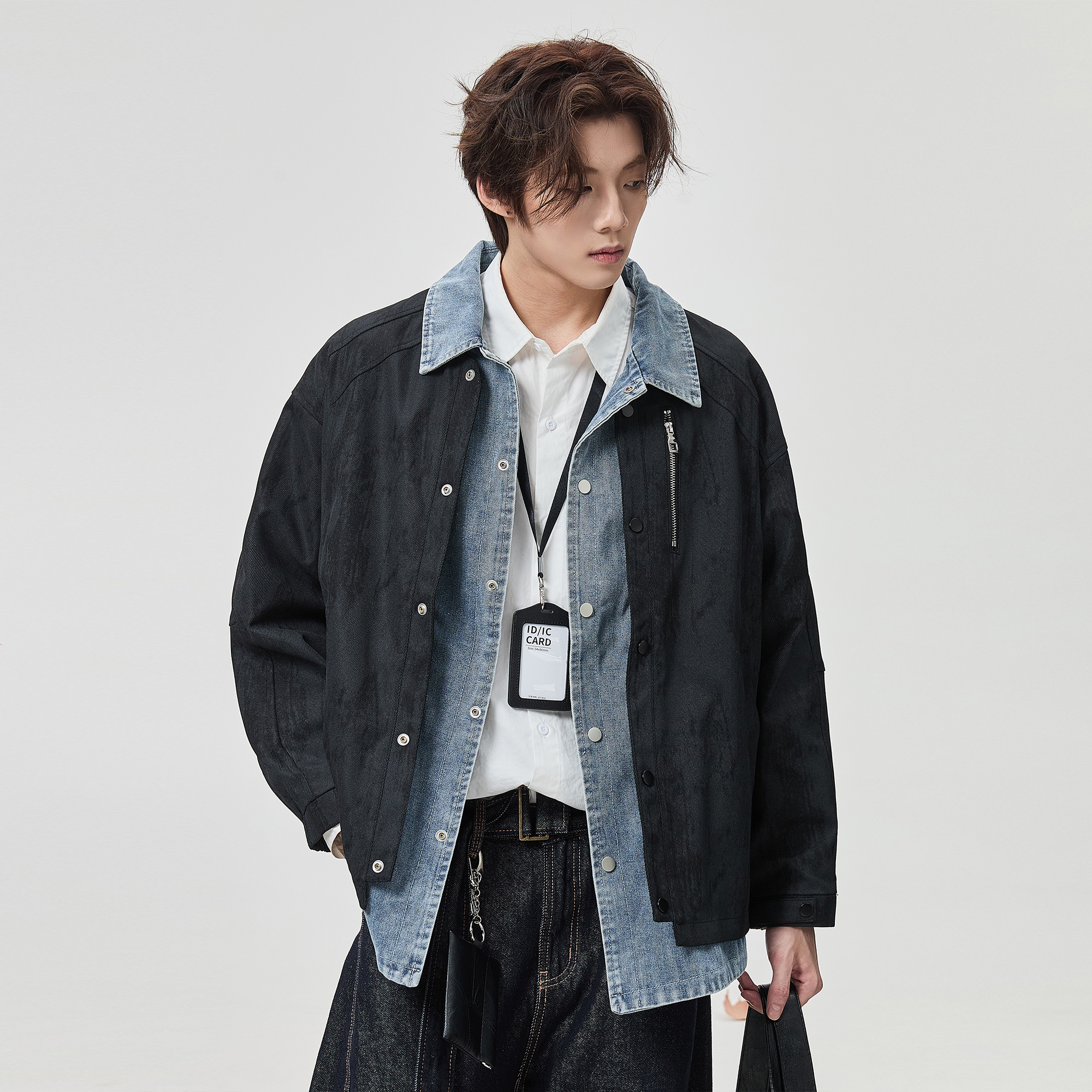 ALLIN 情侣潮牌拼接cleanfit翻领夹克 假两件水洗牛仔外套男秋冬季
