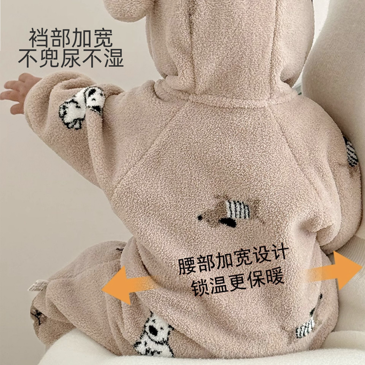 婴儿秋冬季 加绒连体衣保暖家居服连帽超萌宝宝外出爬服半边绒睡衣