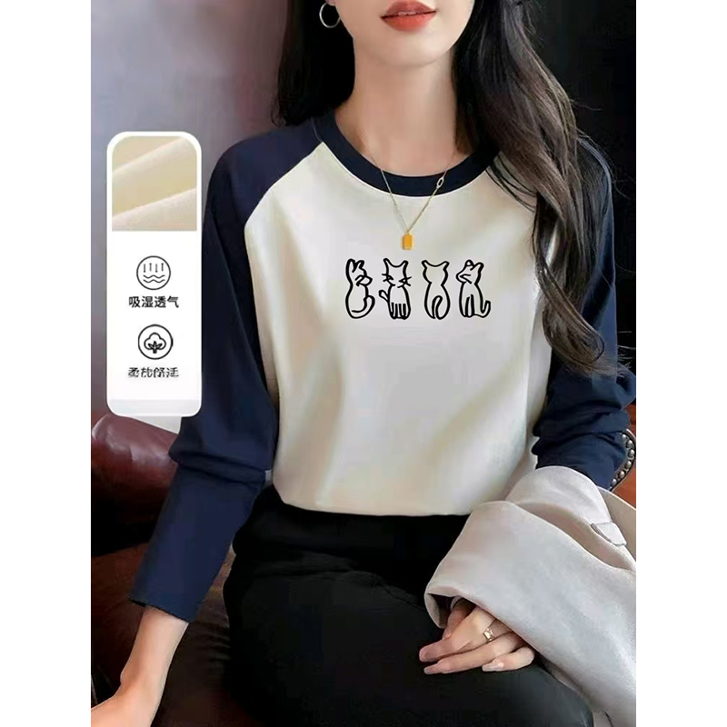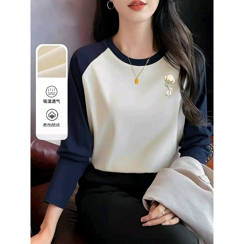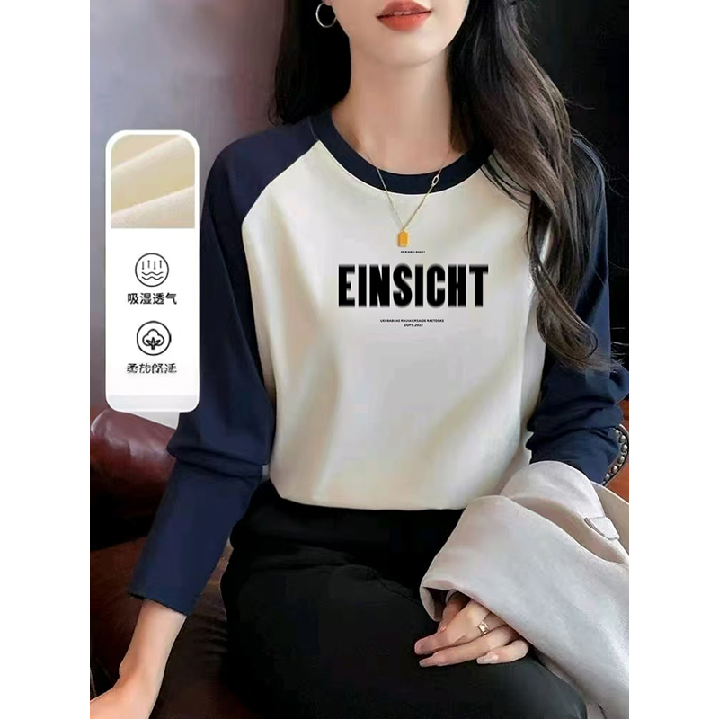 宽松纯棉上衣春秋冬内搭慵懒风打底衫 美式 女装 t恤衫 撞色插肩长袖
