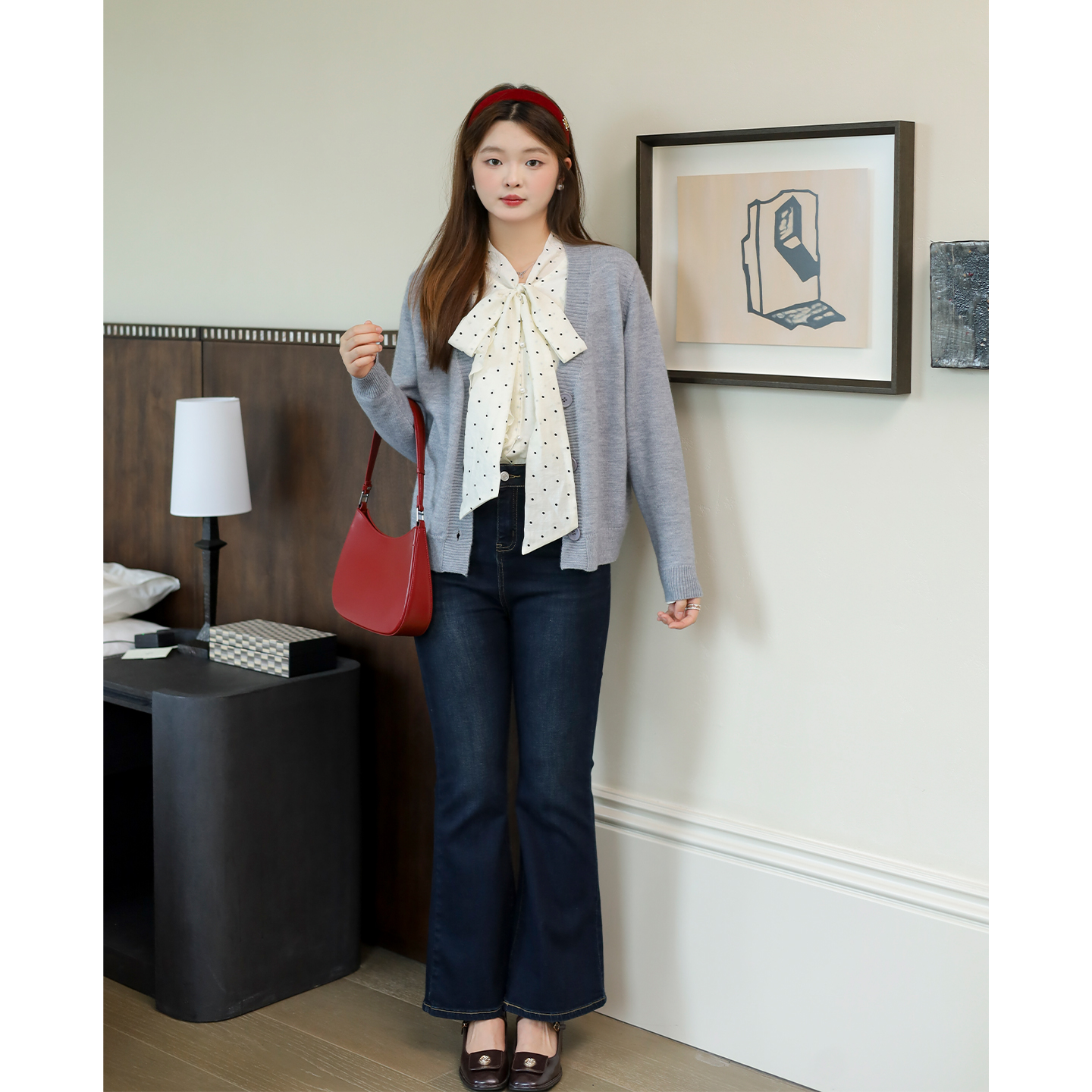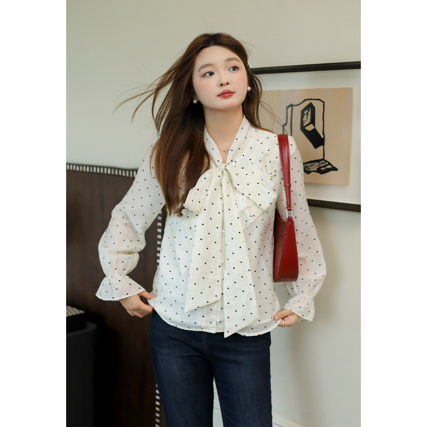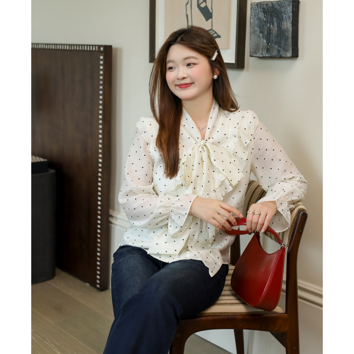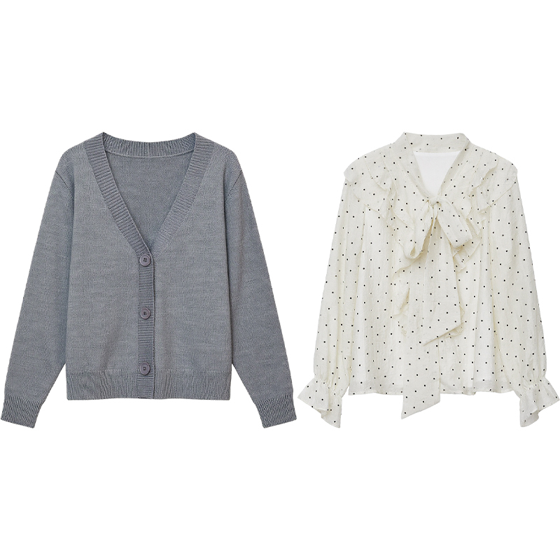套装 微胖mm显瘦2025秋舒适V领正肩毛衣波点飘带衬衫 女装 DM100大码