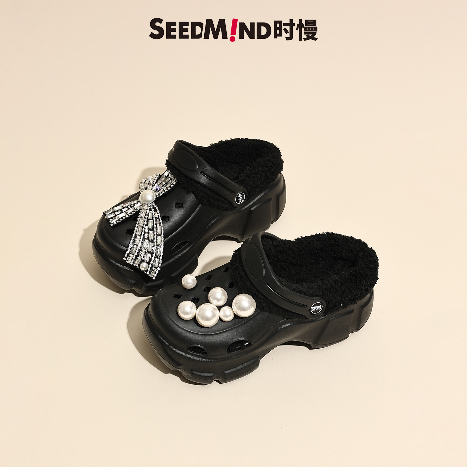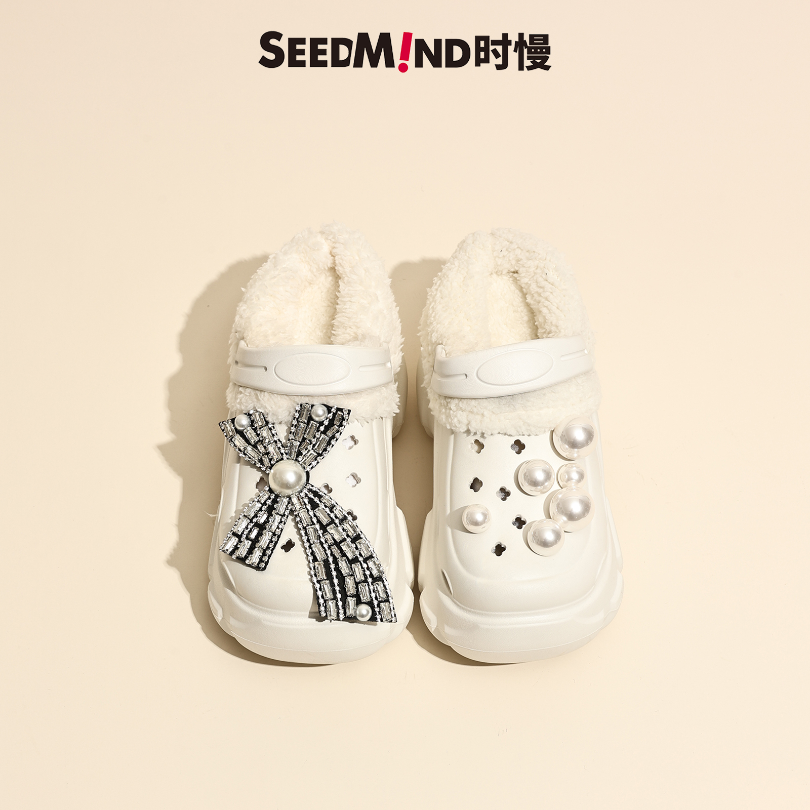 时慢毛绒绒洞洞鞋 女2025秋冬厚底增高加绒外穿水钻包头保暖棉拖鞋