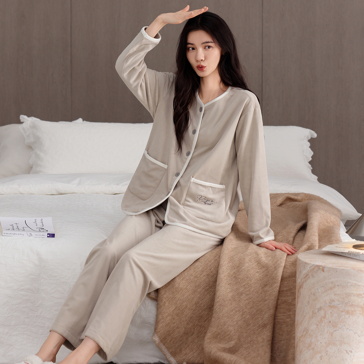 套装 海岛绒秋冬女款 睡衣加厚可外穿珊瑚绒保暖薄绒简约居家服开衫
