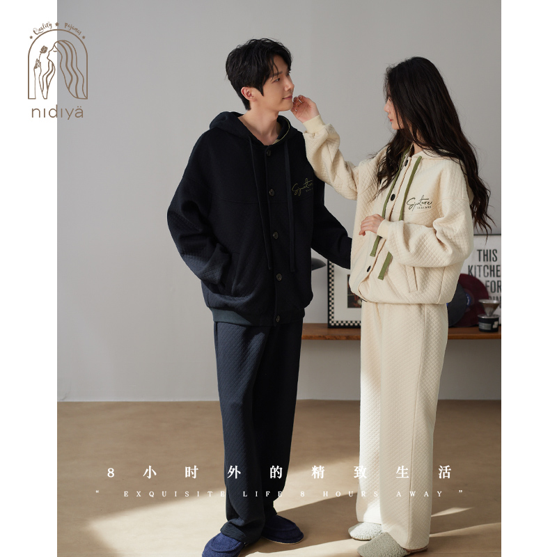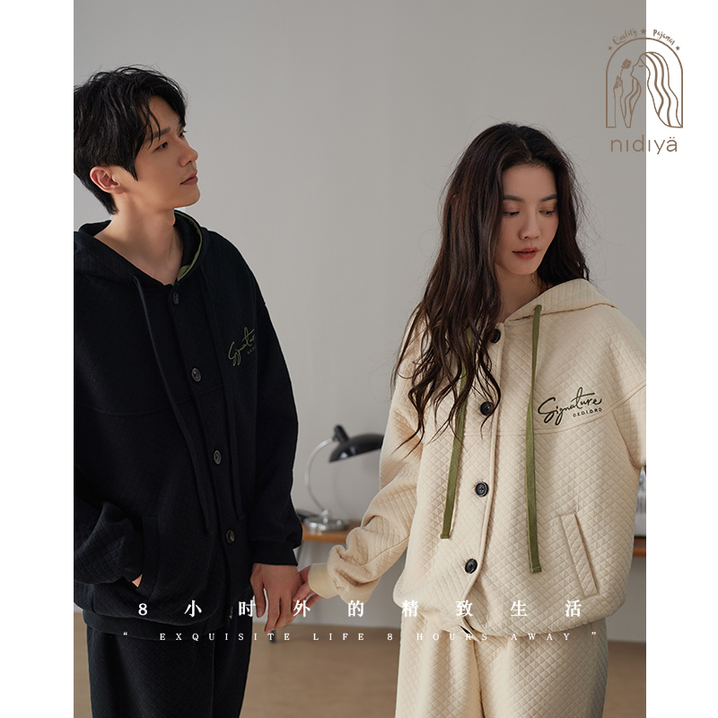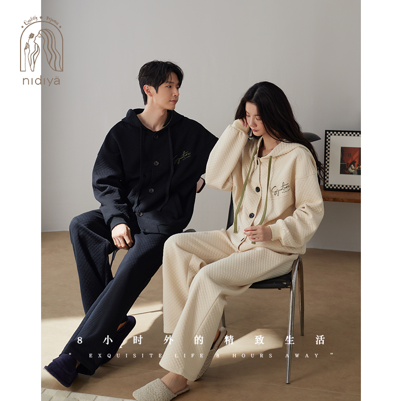 家居服套装 妮狄娅睡衣女纯棉加厚夹层长袖 男休闲连帽可外穿秋冬季