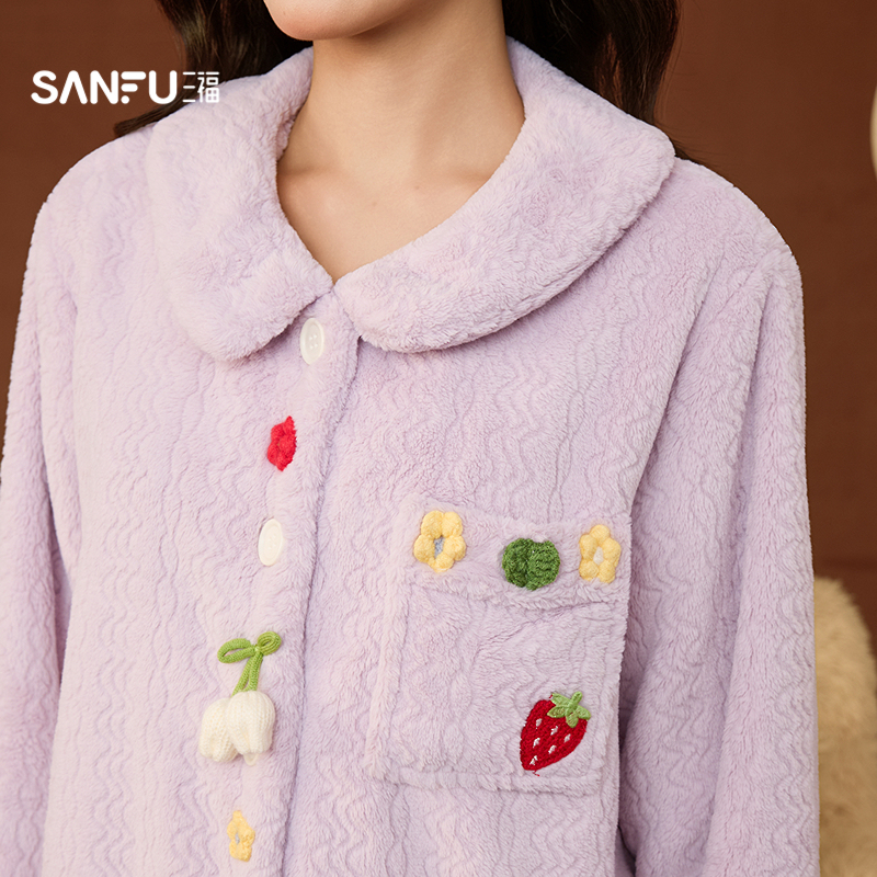 大码 春秋开衫 女士家居服 加厚珊瑚绒睡衣女冬法兰绒加绒套装 秋冬季